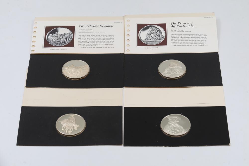 (4) Franklin Mint sterling silver-toned medals inspired by works of Rembrandt, including "Two Scholars Disputing", "The Flight into Egypt", "Self-Portrait" and "The Return of the Prodigal Son". Each medal features a sculpted design on the obverse and descriptive text on the reverse. Includes corresponding booklet pages with image details and background information. Total weight being 264 grams.