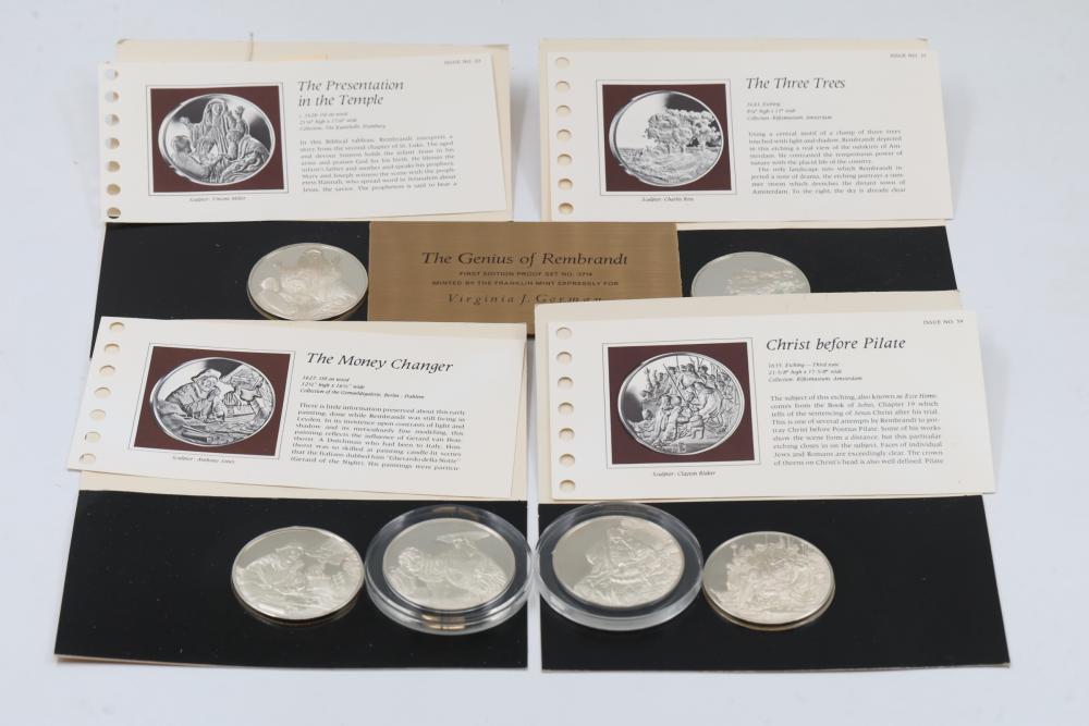 The Genius of Rembrandt First Edition Proof Set by Franklin Mint, number 3714. Includes multiple silver medallions depicting scenes based on Rembrandt's works, such as "The Money Changer", "The Three Trees" and "Christ before Pilate" with corresponding descriptions and certificates. Six total. Total weight being 396 grams.