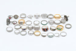 Rings crafted in mixed metals, including silver and gold tones, featuring a range of styles and gemstones such as clear, green, and red stones. The designs include bands, clusters, and intricate detailing. Includes both decorative and statement pieces. Total weight being 204 grams.