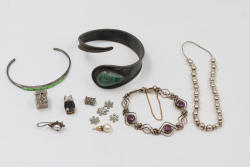 Jewelry including two bracelets, one with green enamel details and another featuring a green stone. Includes multiple silver-tone earrings, pendants, and charms with pearl-like and stone accents. Also included are necklaces, one with silver-tone beads and another with a chain-link design featuring purple stones. Total weight being 60 grams.