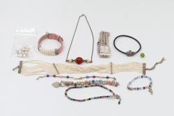 Jewelry pieces including beaded necklaces, pearl and gem bracelets, and a silver-tone quartz watch with Roman numeral markers. Highlights include a red carved bead necklace, pearl-like multi-strand bracelet sets, and colorful bead strands. Includes a black cord bracelet with rhinestone details and a single glass bead. Total weight being 156 grams.