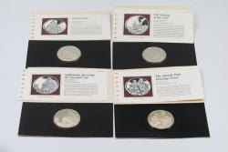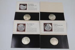 (4) Franklin Mint sterling silver medals featuring engraved designs based on Biblical themes and classic portraits, including "The Incredulity of the Apostle Thomas", "Portrait of Nicolaes Ruts" and "The Good Samaritan". Each medal is accompanied by detailed informational cards. Total weight being 264 grams.