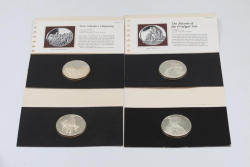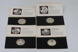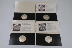 (4) Franklin Mint Sterling Silver Medallions Depicting Rembrandt Scenes. Includes four medallions showcasing detailed artwork inspired by Rembrandt: "Christ in the Storm on the Sea of Galilee", "Portrait of Jan Six", "Tobit and Anna with the Kid" and "Portrait of Jan Uytenbogaert." Each medallion features intricate engravings and comes with descriptive cards. Total weight is 264 grams.