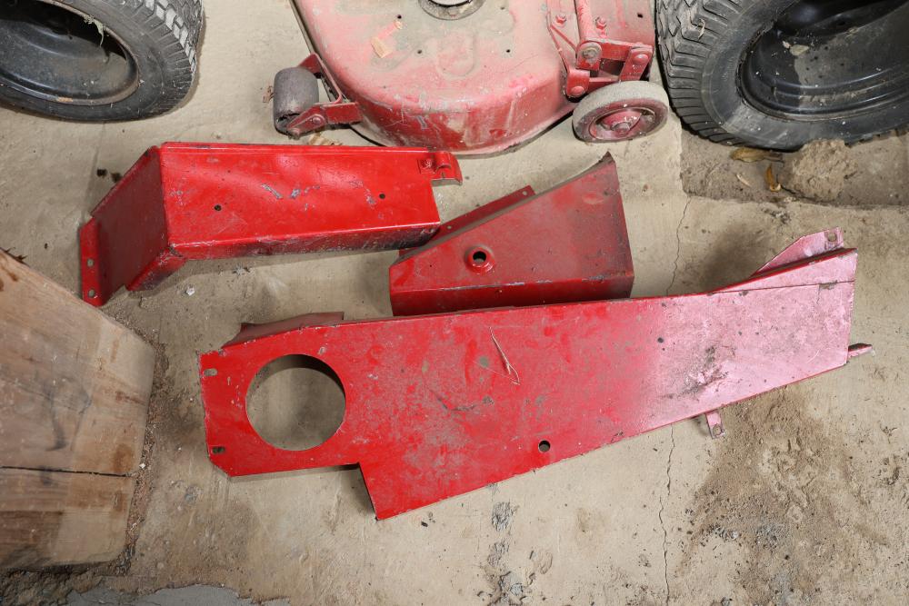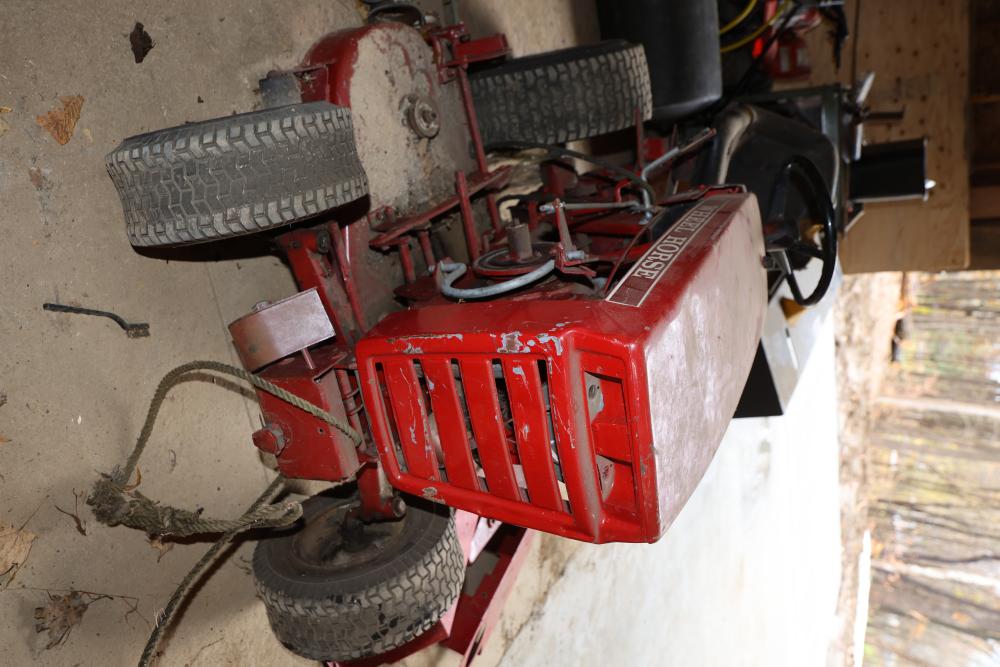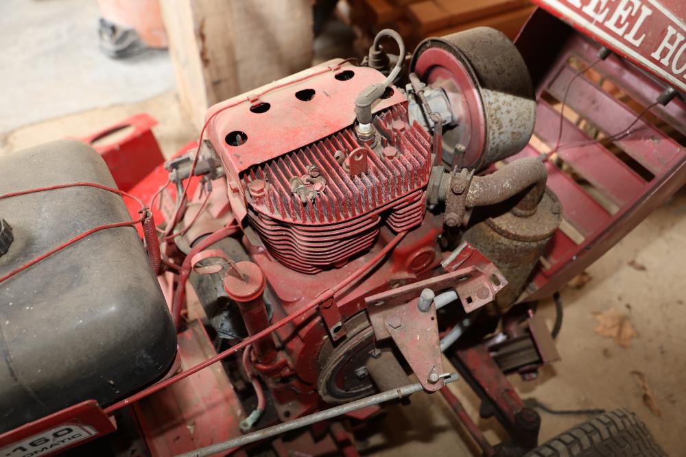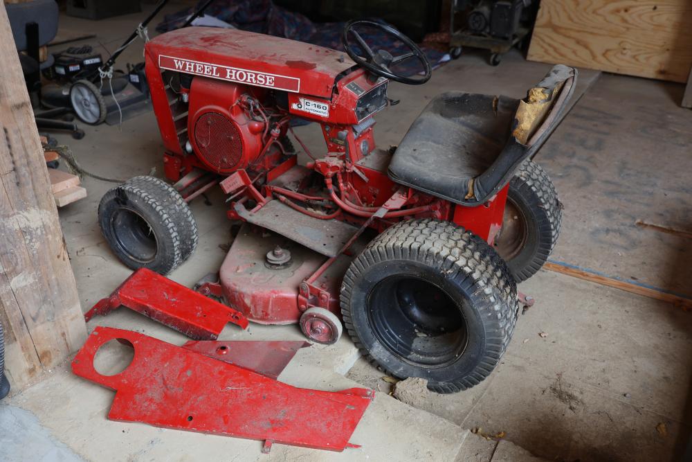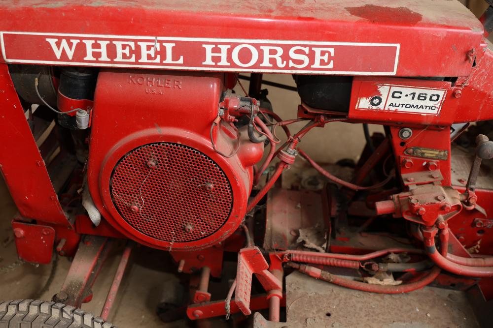 Wheel Horse C-160 Automatic Garden Tractor with Kohler Engine. Features a Kohler engine, mower deck, and manual steering wheel. Includes additional red body panels. Buyer is responsible for all help and materials necessary for removal. Operation unknown. Pickup only.