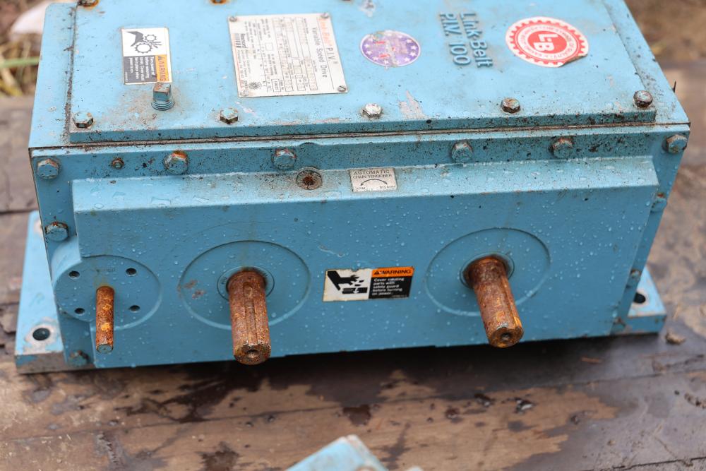 Link-Belt PIV 100 Variable Speed Drive Model 04100428C with 40:1 Ratio. Motor HP at input: 1.75 HP, SF: 1.0. Max RPM: 1750. Includes 3 output shafts. Output rating: 0.602 HP and a service rating of 1.0. Max input temperature: 40 degrees Celsius with lubrication requirements at ISO VG 220. Operation unknown. Pickup only.