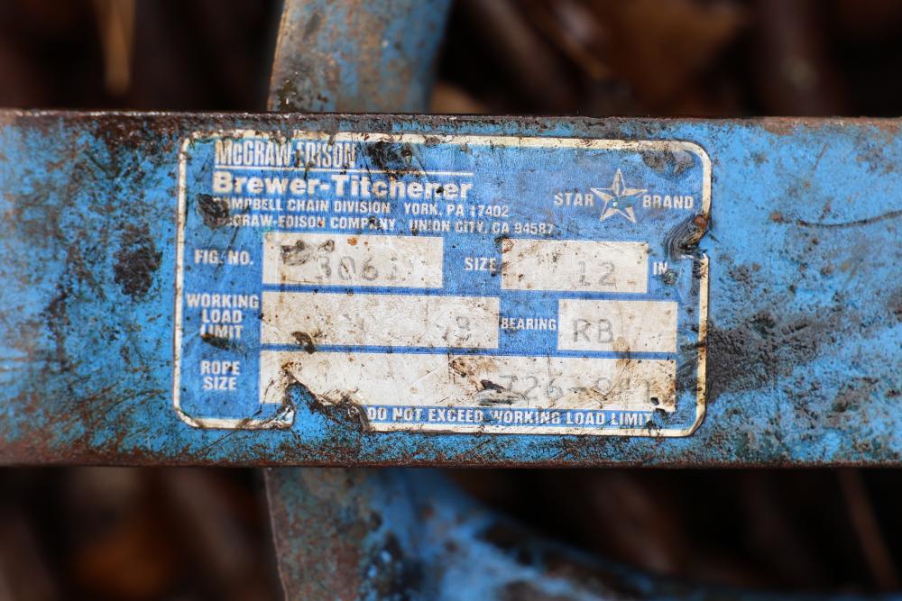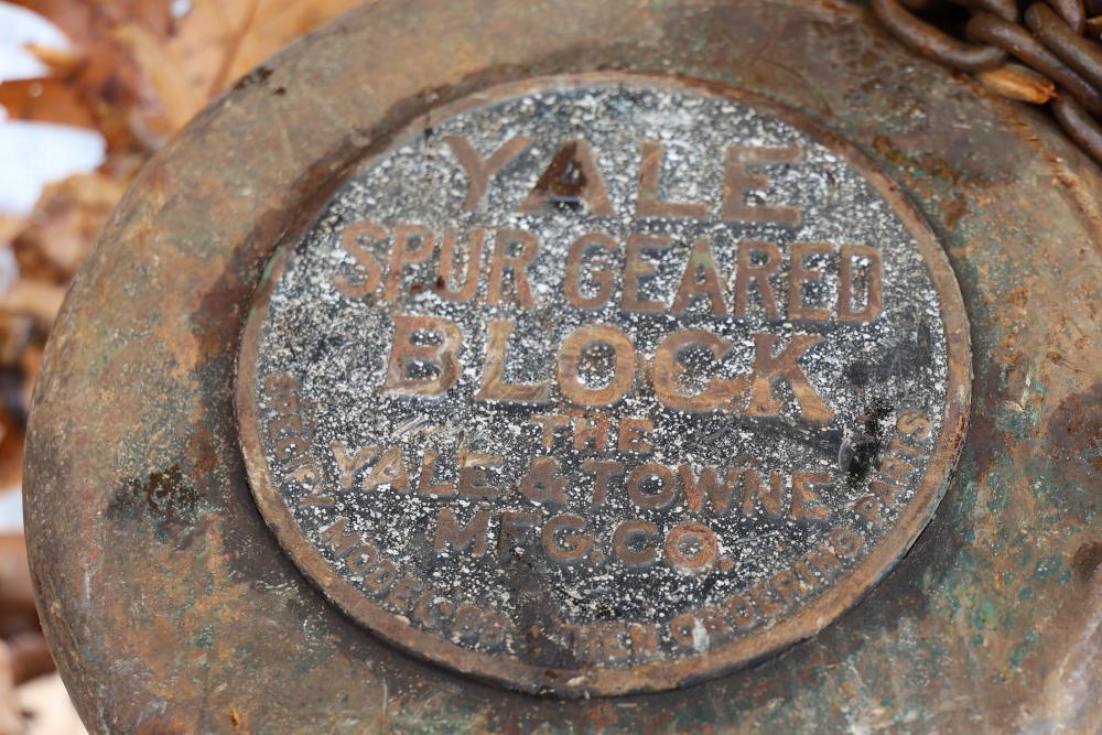 McGraw Edison Brewer-Titchener pulley system and Yale Spur Geared Block with chains. Identifiable details include Yale Model BB with a 2000-pound capacity and McGraw Edison Rope Size RB. Pickup only.