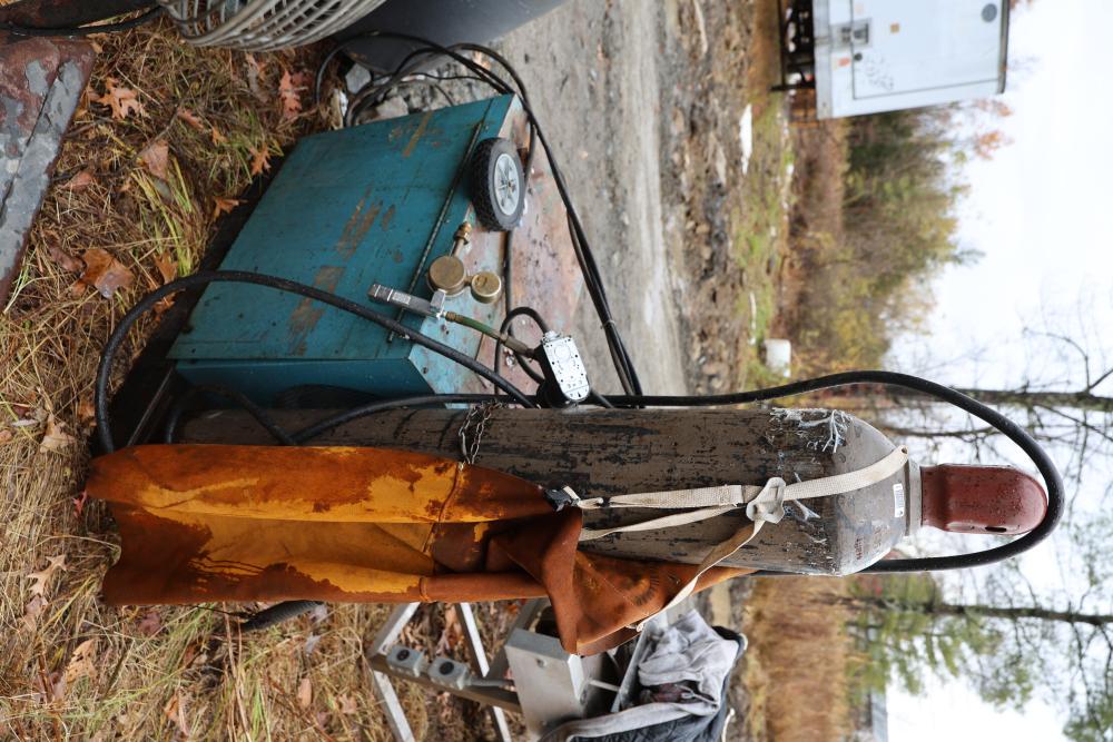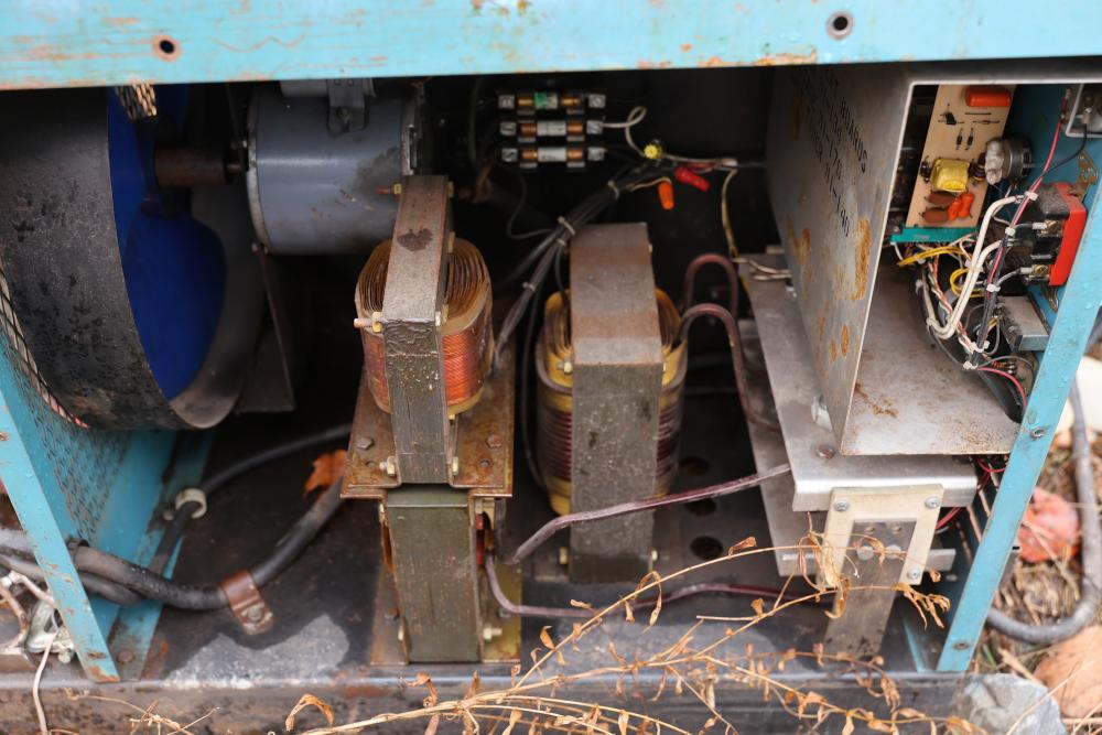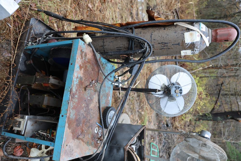 Systematics MIG 185 Welding Machine With Accessories. Includes MIG 185 welding unit, visible internal components, gauges, a plug attached to wires, and a gas cylinder with regulator and additional hoses. This machine and its components are no longer functional. Operation unknown. Buyer is responsible for all help and materials necessary for removal. Open trailer recommended. Pickup only.