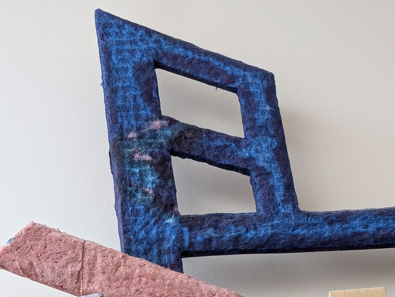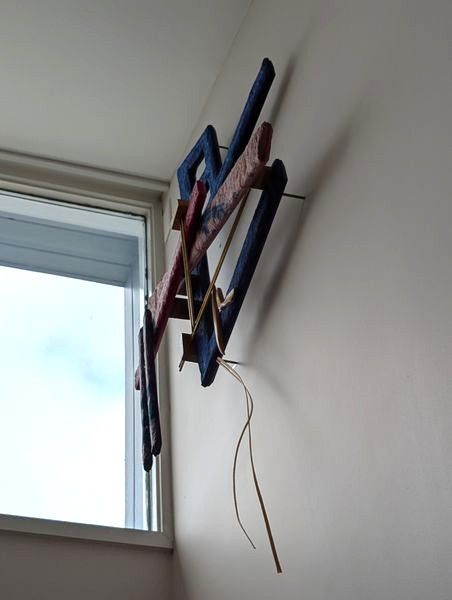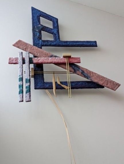 Custom Wall Décor. Wall art from Paradise City juried art show in North Hampton, custom made for seller, approx. 28"Wx28"H. Seller reports, "The artist is Sabra Richards from Honeoye NY. It is handmade with abaca fiber from the Philippines & Chinese cotton fiber. Pure color pigment has been used & the pulp is backed with two-sided birch plywood to prevent any warpage. Solid brass rods & box joints were used. Brazilian tulip wood, mahogany, chatacoke & rosewood were added for structure & texture interest." Will require a tall ladder to remove.