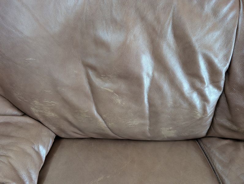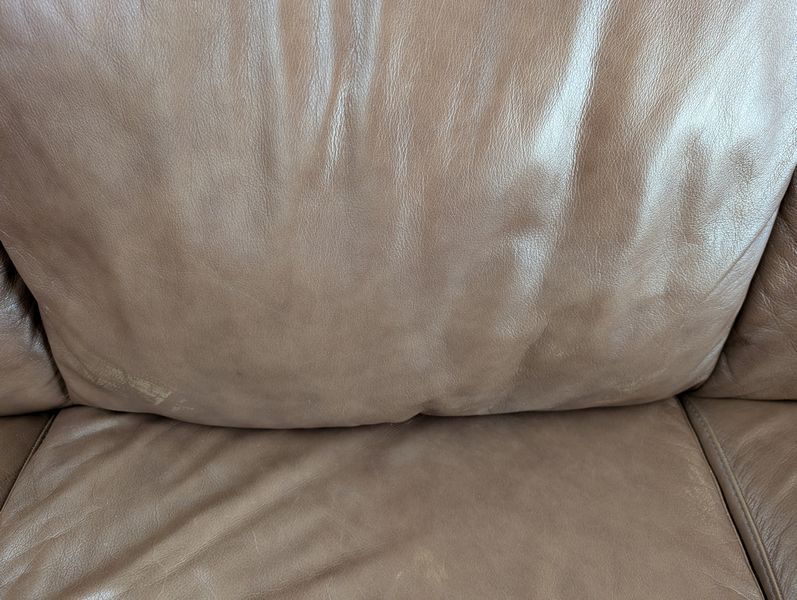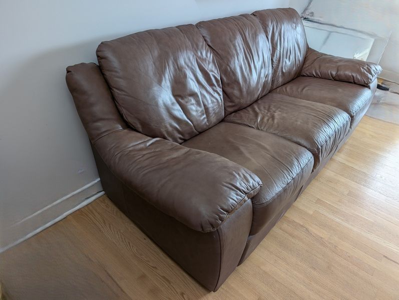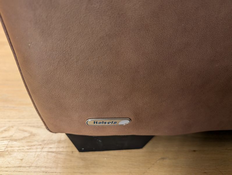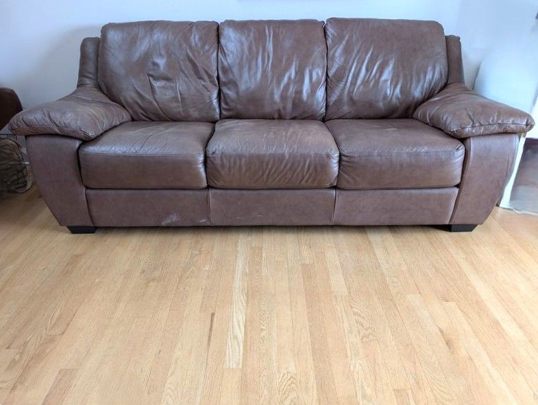 Italian Leather Sofa and Ottoman. Light brown three-seater sofa with matching ottoman by Italsofa, 90"Lx3'Dx34"H with matching rectangle ottoman. Overall good condition, no tears (see photos of surf marks).