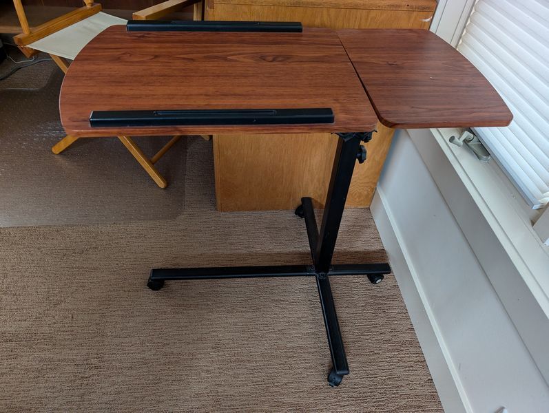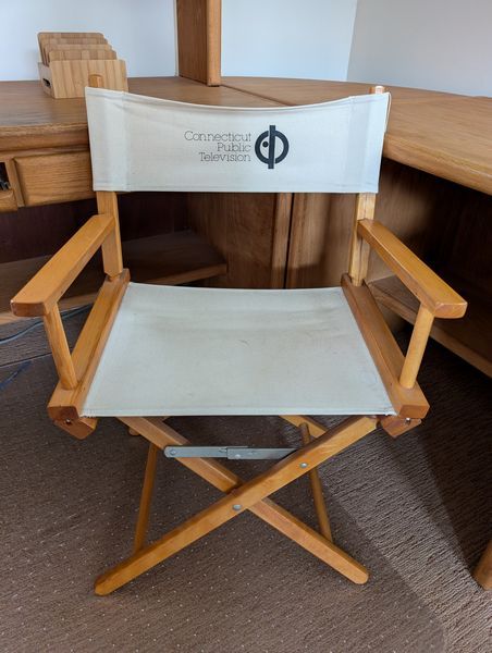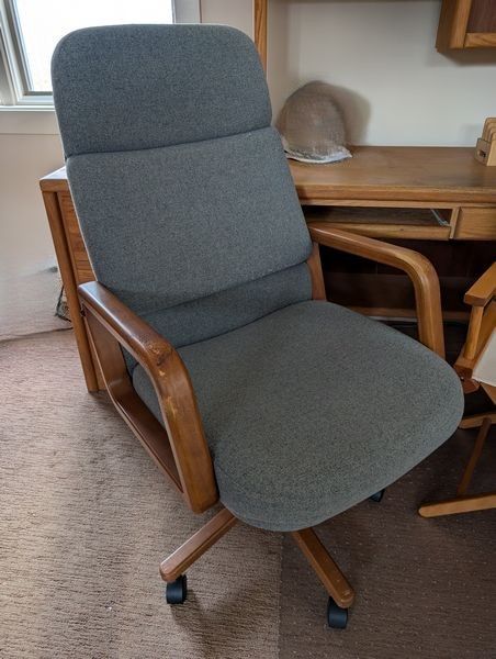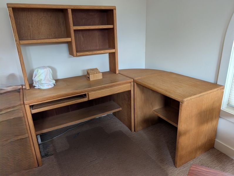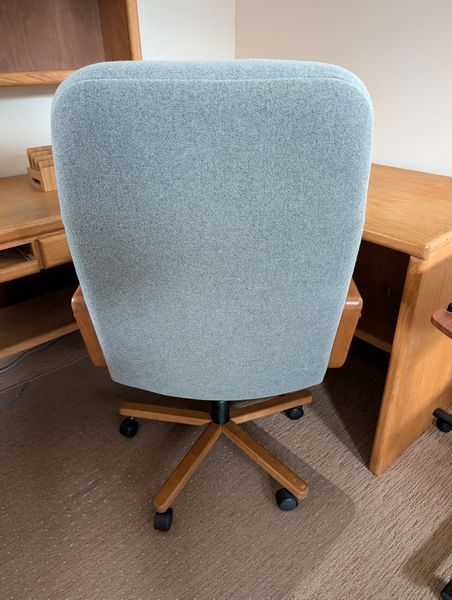 Four Piece Desk, Office Chairs. Four-piece desk set including 4'Wx2'Dx30"H desk with pencil drawer & pull-out tray; side table with shelf, 30"Wx2'Dx30"H, corner connector, 2'D; 34"H hutch; adjustable side table; blue office chair on casters with light wood arms, 25"Wx2'Dx44"H; CPTV director's chair; phone charging station; optional carpet protector.