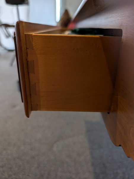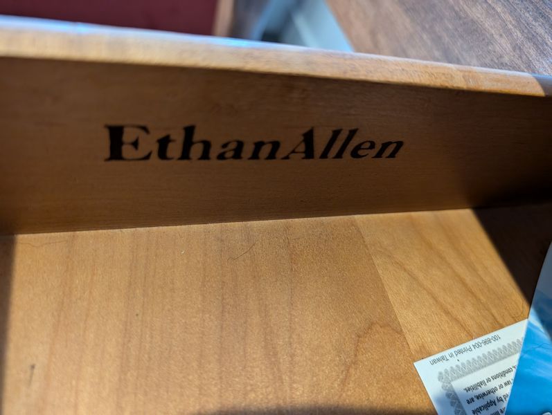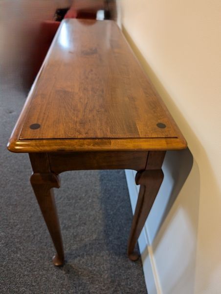 Ethan Allen Queen Ann Sofa Table. Maple sofa table by E.A. with beveled edge & dovetailed drawers, 5'Lx16"Ddx27"H. Located in the lower level.