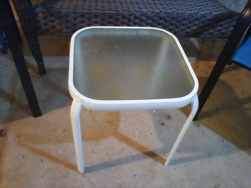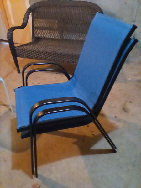 Outdoor Furniture. Incl: resin two-seater bench, 47"Wx18"Dx35"H; pair of blue nesting canvas & black metal armchairs; white glass top side table. Located under the house in basement storage, Access from outside, back of house.
