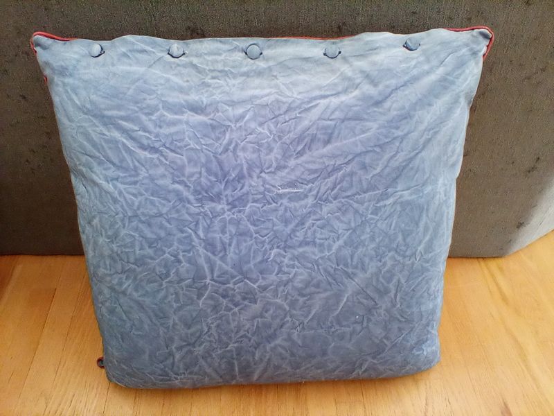 Iron Bench, Pillow, Décor. Iron outdoor bench, sleigh-style, 57"Lx19"Wx38"H with gr removable cushion (not photographed); oversized reversible pillow, 28"sq; pair of wicker handle vessels, ea. 17"H.