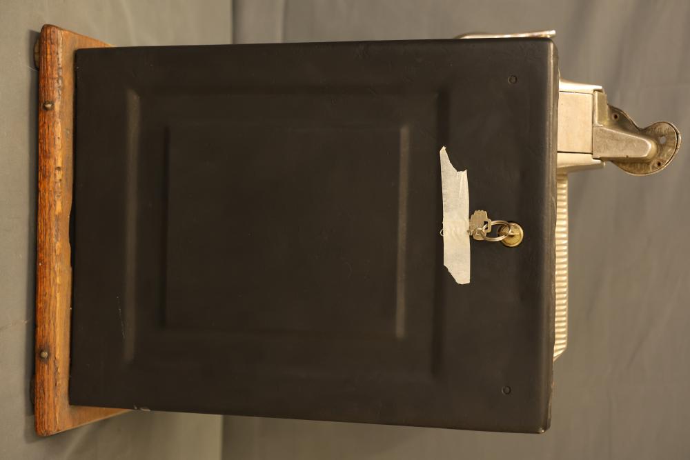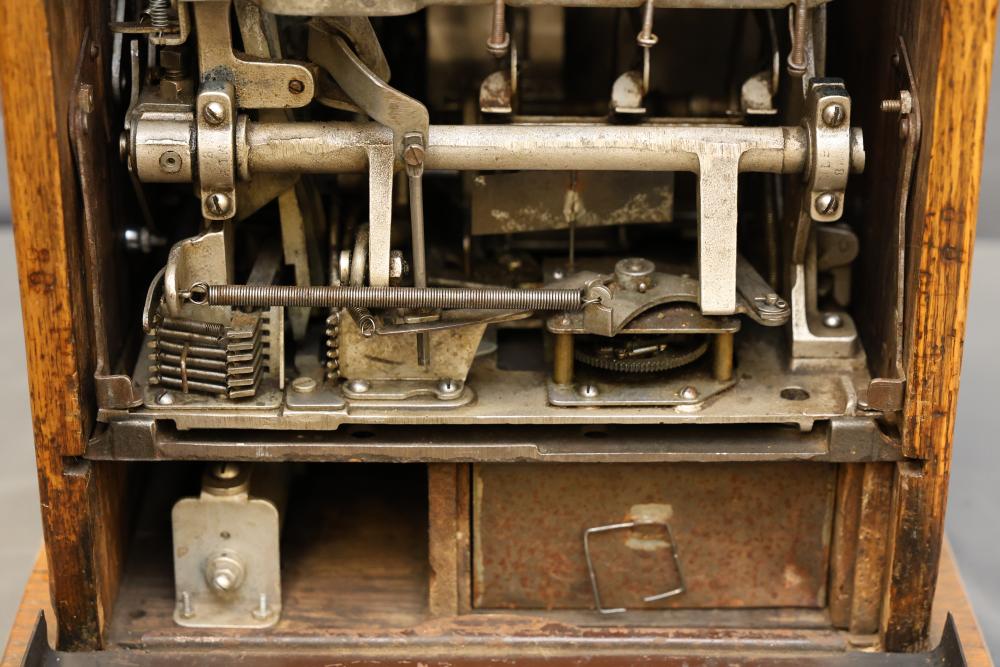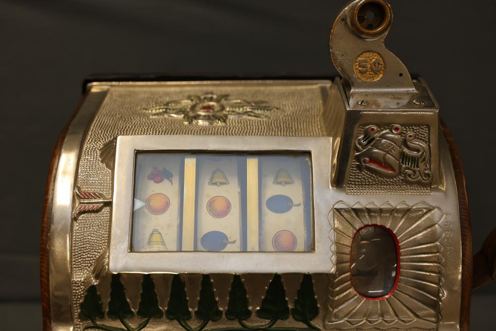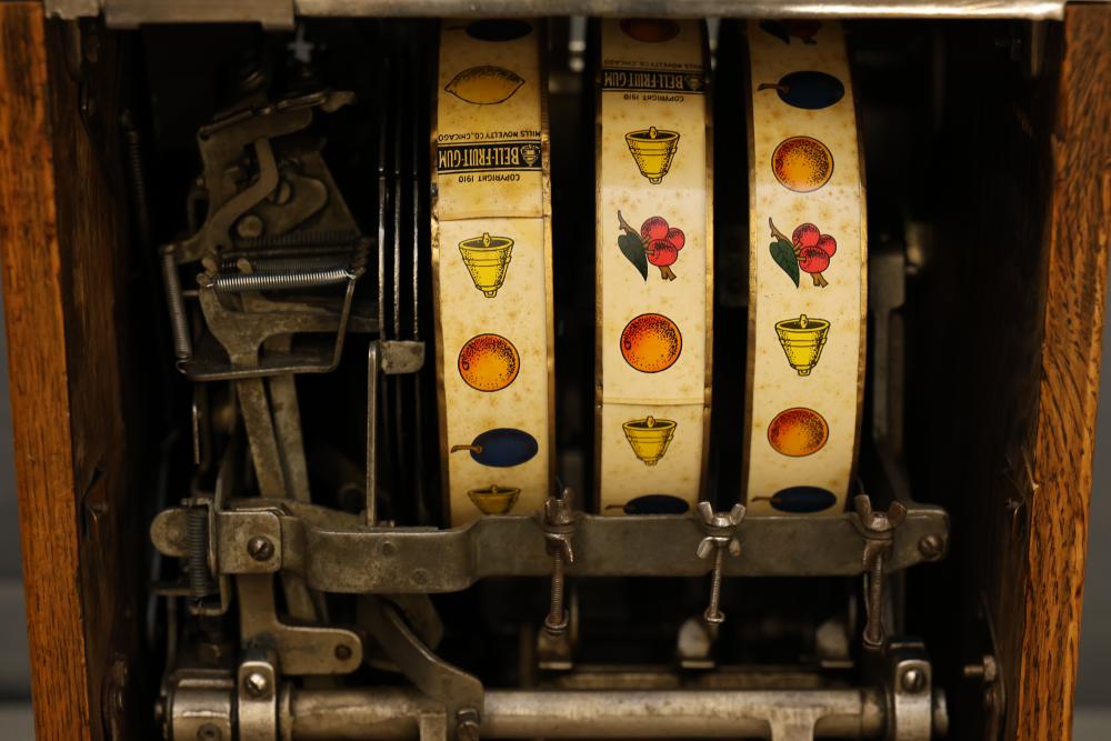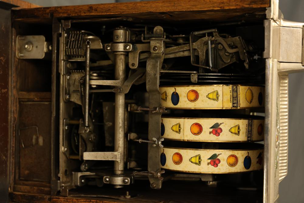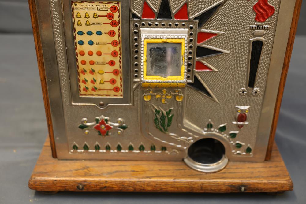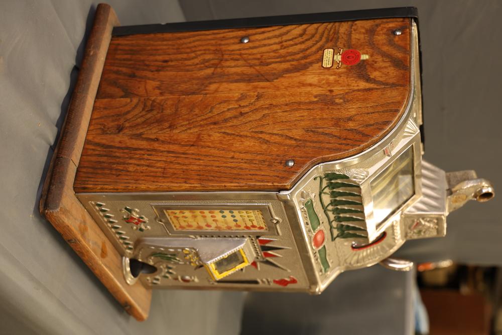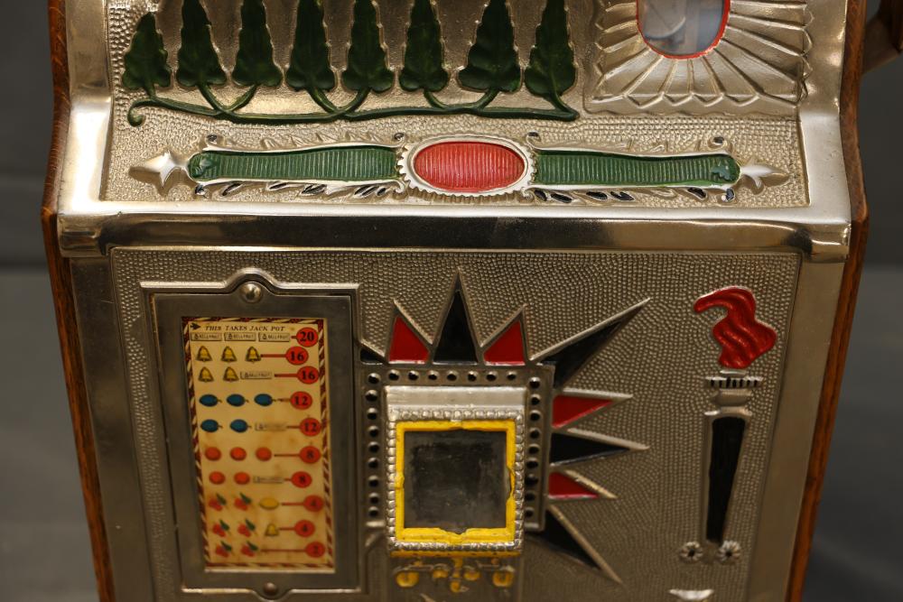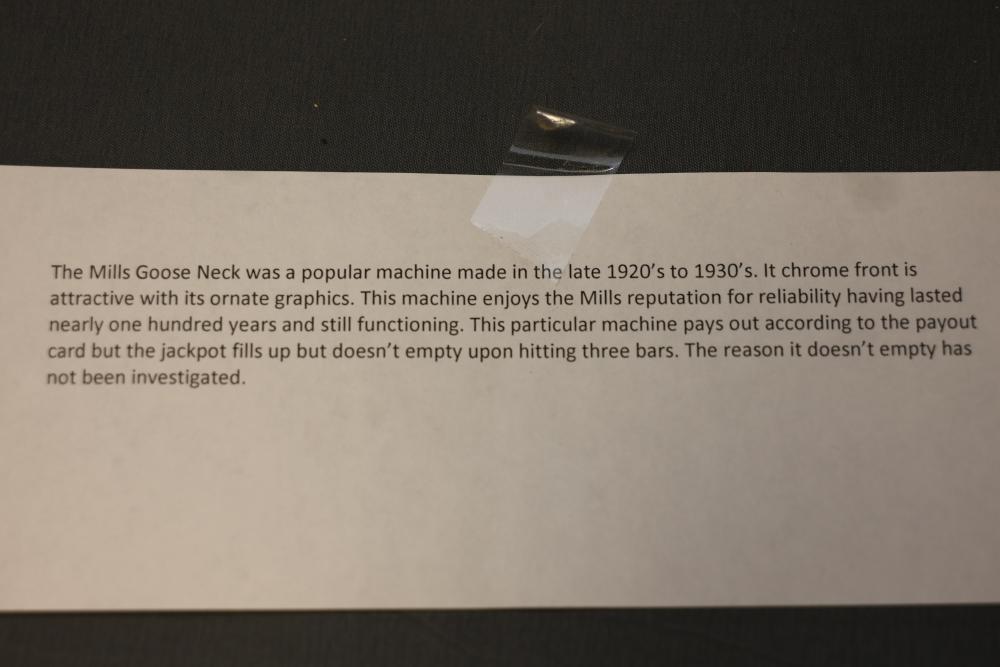 Mills Goose Neck Slot Machine with Chrome and Wood Case. Featuring a chrome front panel with ornate detailing and colorful graphics, including trees, a torch, and a payout chart. Inner mechanisms exposed in some images include three spinning reels with fruit graphics, payout slots, and coin collection bin. Wood side panels and sturdy base show wear consistent with age. Not tested for functionality. Pickup only.