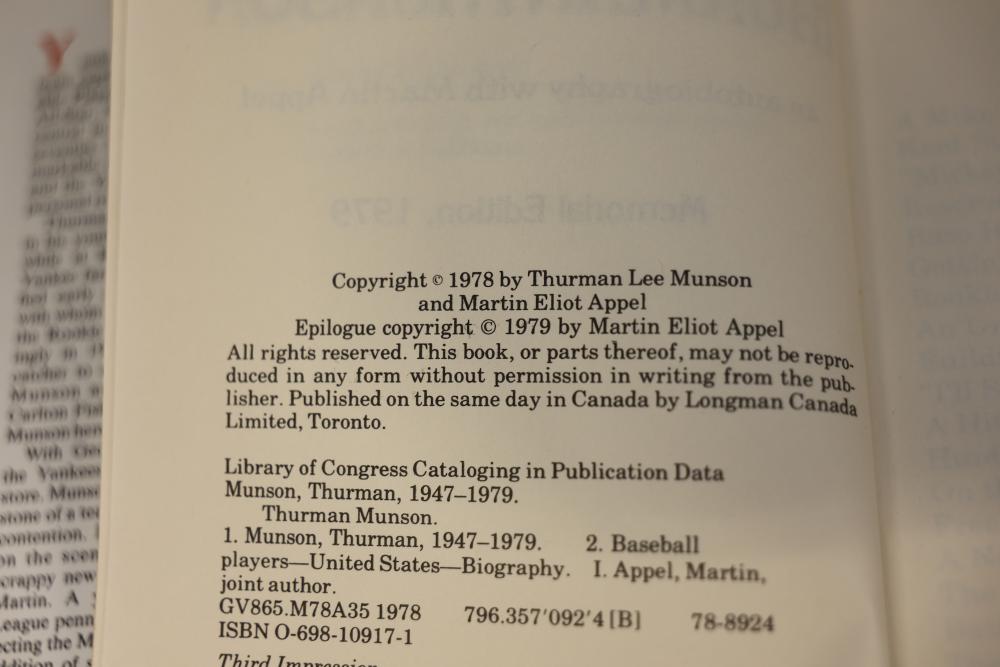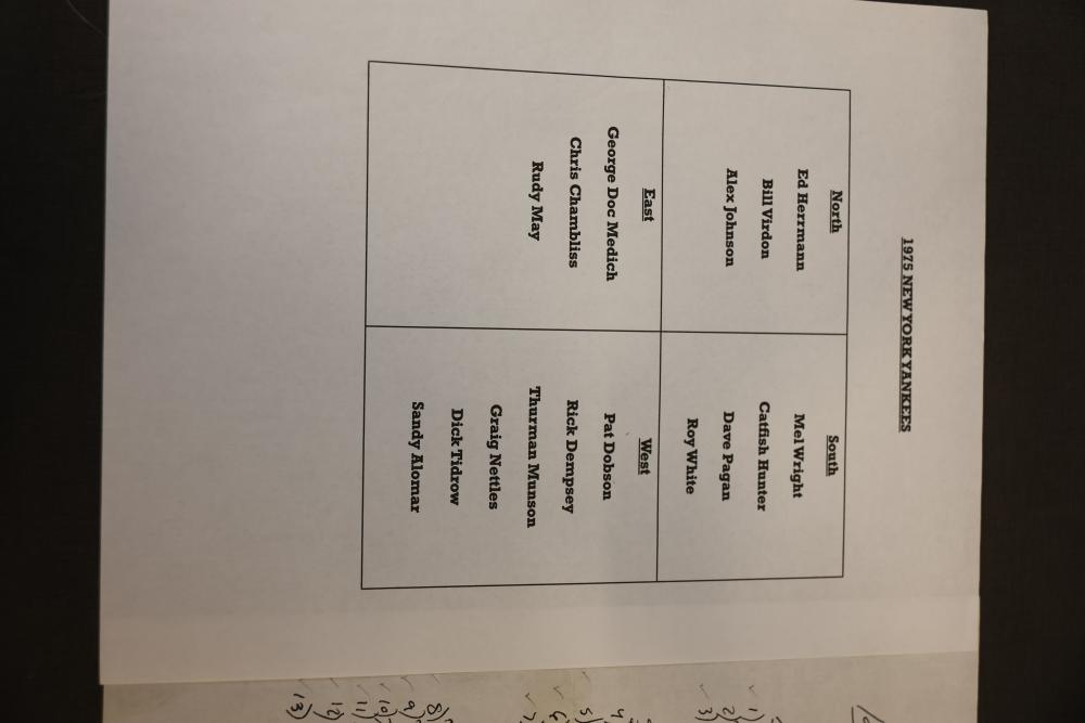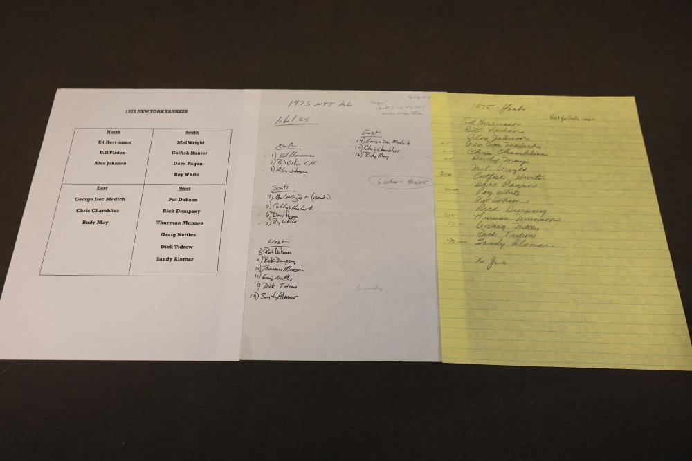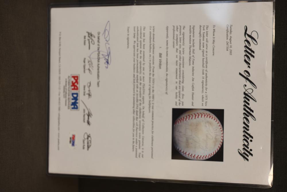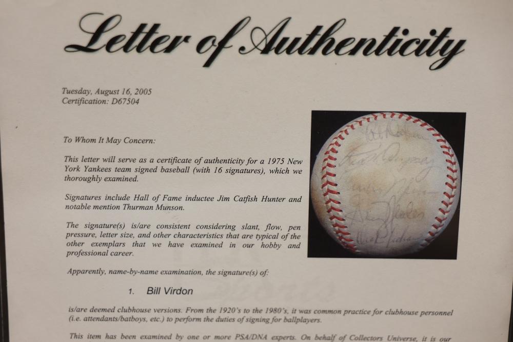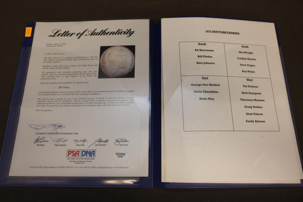 1975 New York Yankees team signed baseball with signatures including Hall of Fame inductee Jim Catfish Hunter and notable mention Thurman Munson. Comes with a Letter of Authenticity, a book on Thurman Munson, and additional documentation. Pickup only.