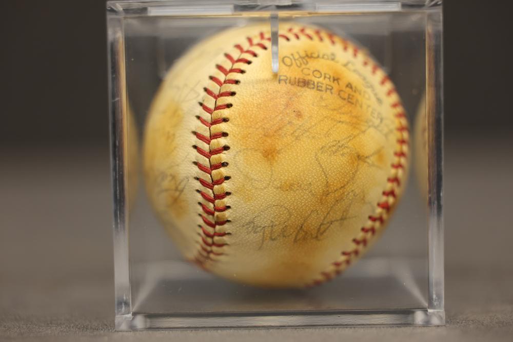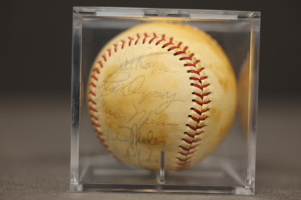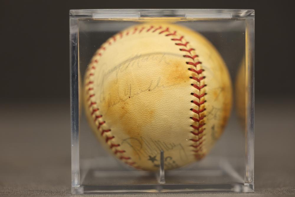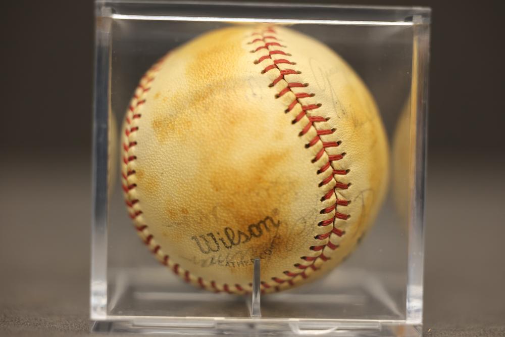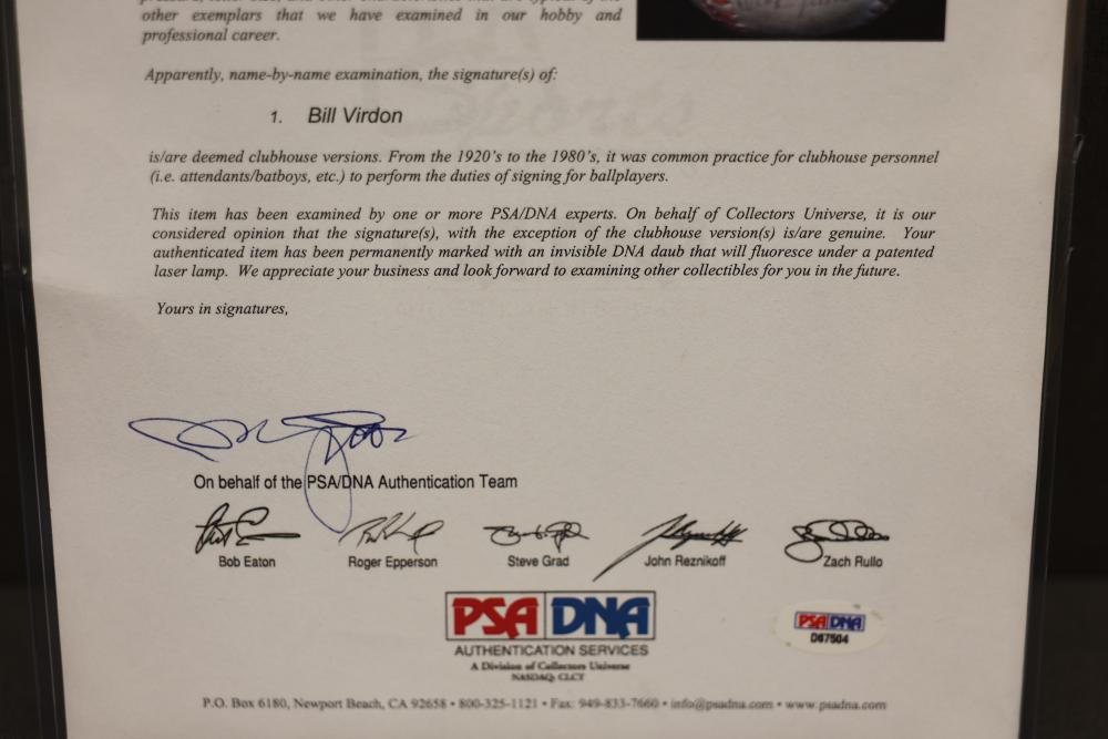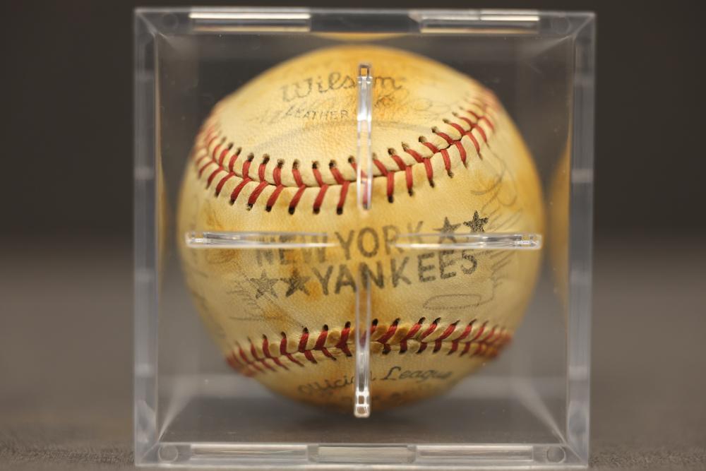 1975 New York Yankees team signed baseball with signatures including Hall of Fame inductee Jim Catfish Hunter and notable mention Thurman Munson. Comes with a Letter of Authenticity, a book on Thurman Munson, and additional documentation. Pickup only.