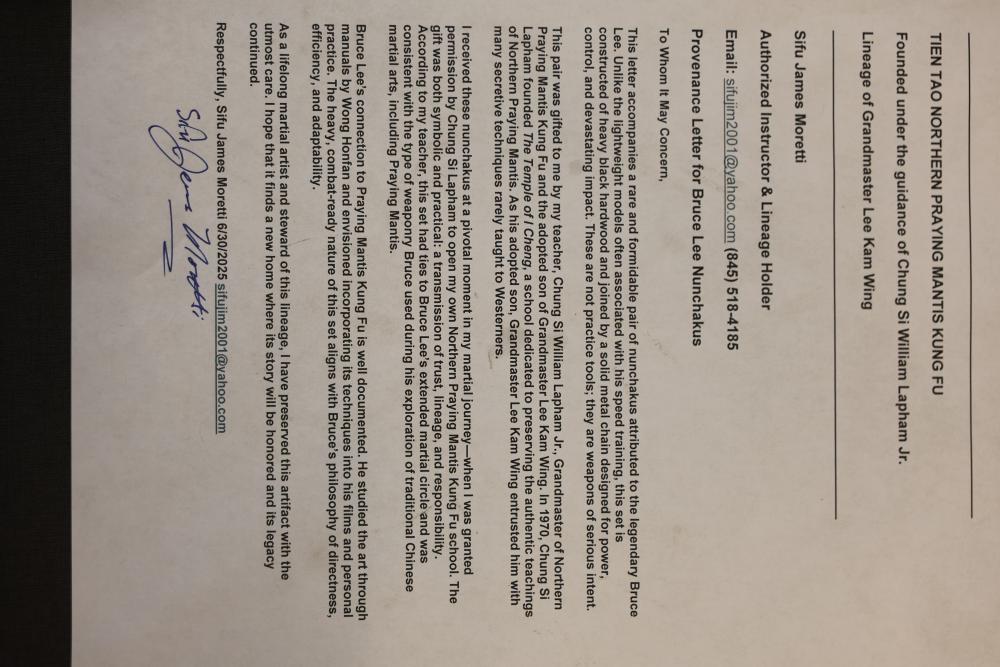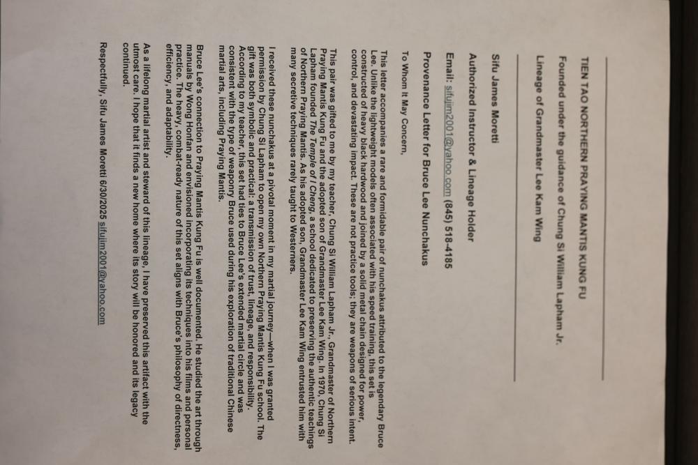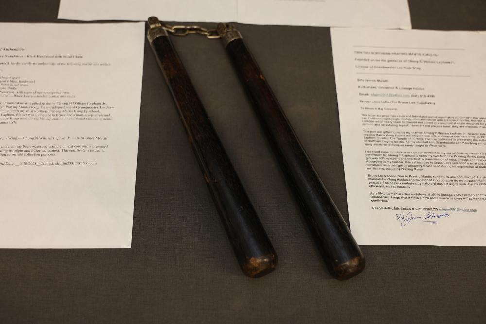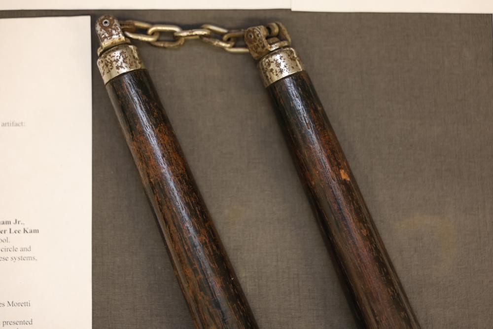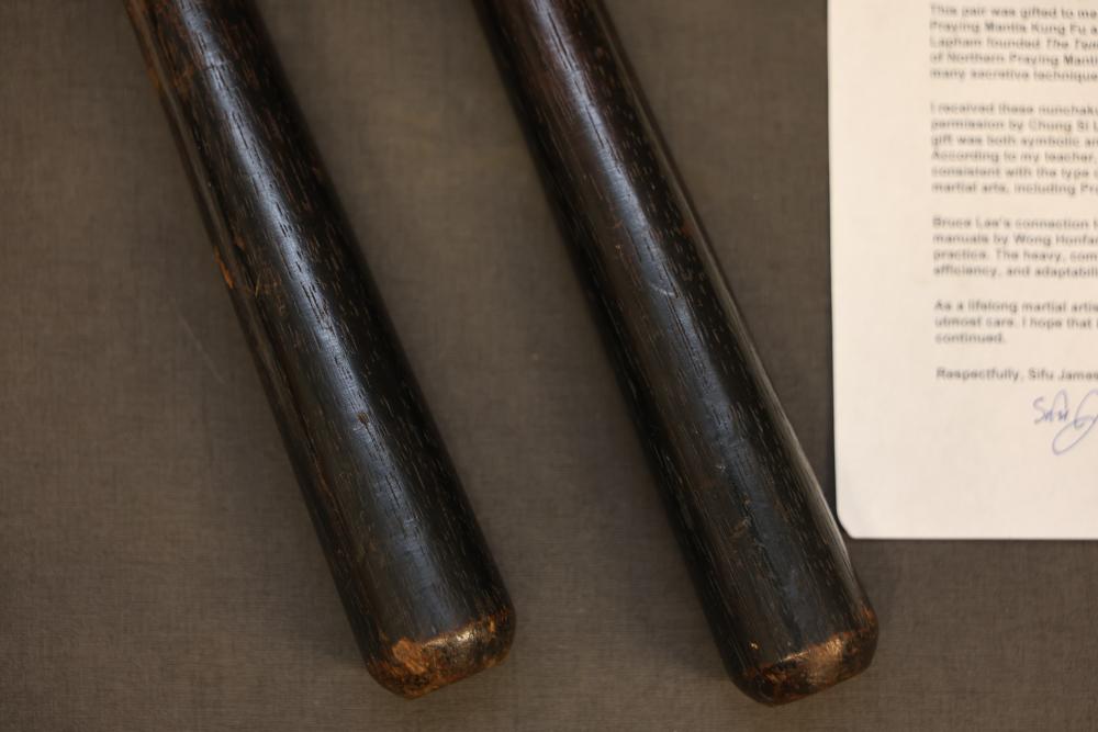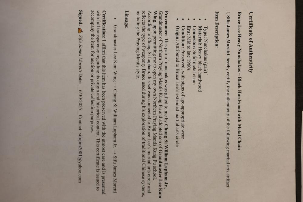 Bruce Lee Lineage Black Hardwood Nunchakus with Metal Chain. The nunchakus feature visibly worn black hardwood handles, connected by a metal chain secured with decorative caps, showing distinct signs of use and age. Seller reports: these nunchakus are related to Bruce Lee’s martial arts lineage, referencing specific documentation supporting this association. Pickup only.