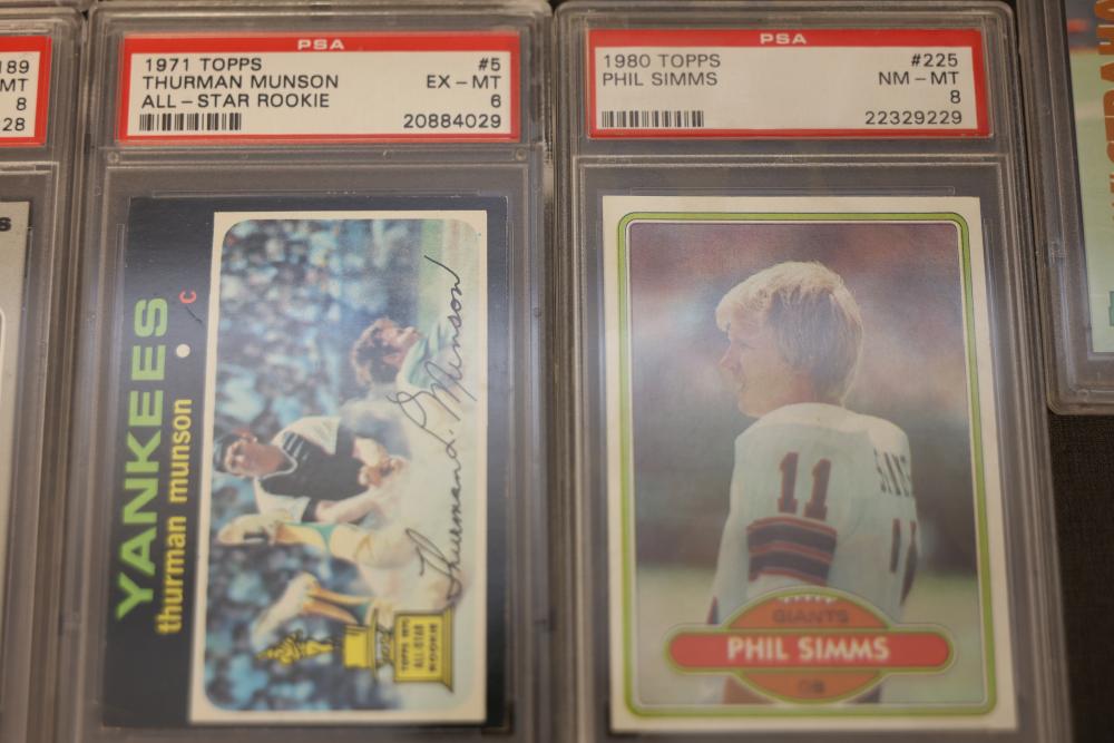 PSA-graded sports trading cards featuring multiple rookie and all-star players, including cards from 1976, 1978, 1982, and 1993. Highlights include Thurman Munson, Lawrence Taylor, Michael Strahan, and others. Cards are encapsulated for preservation with labels indicating grades. Pickup only.
