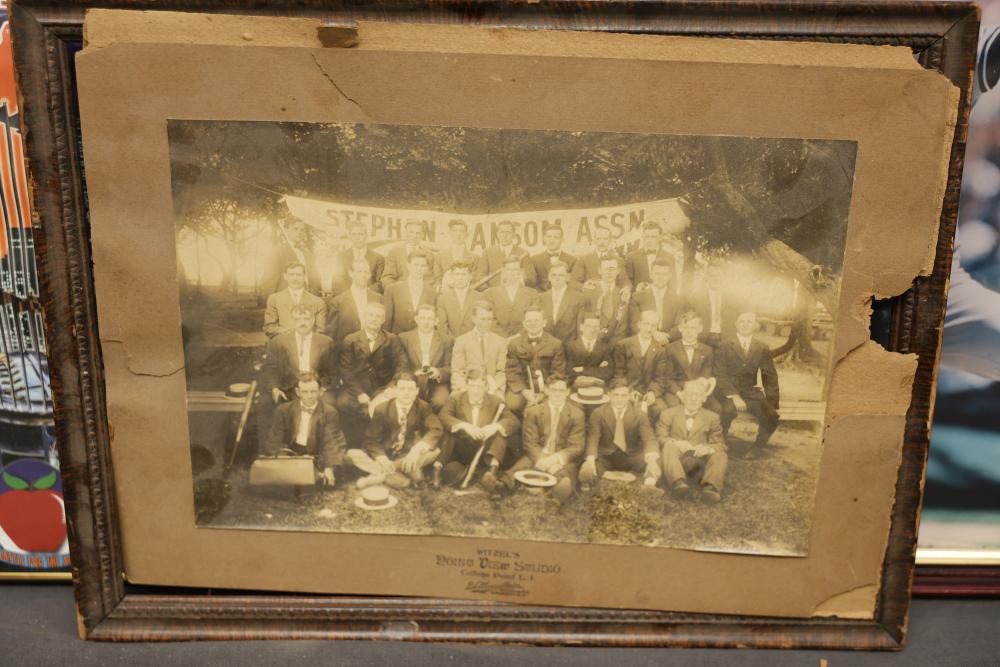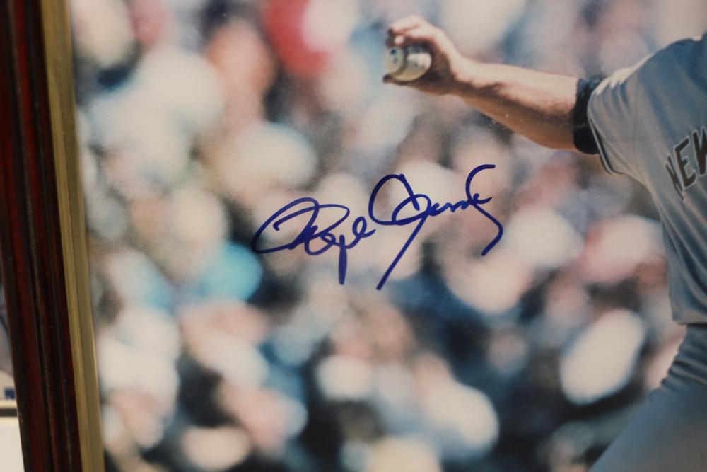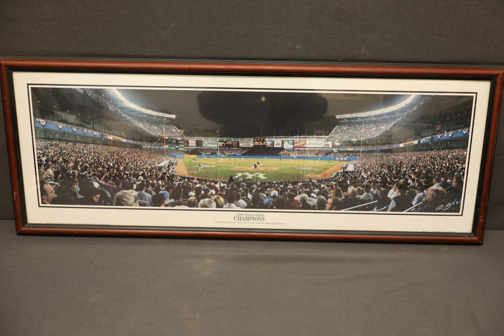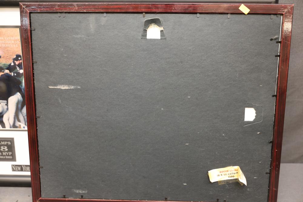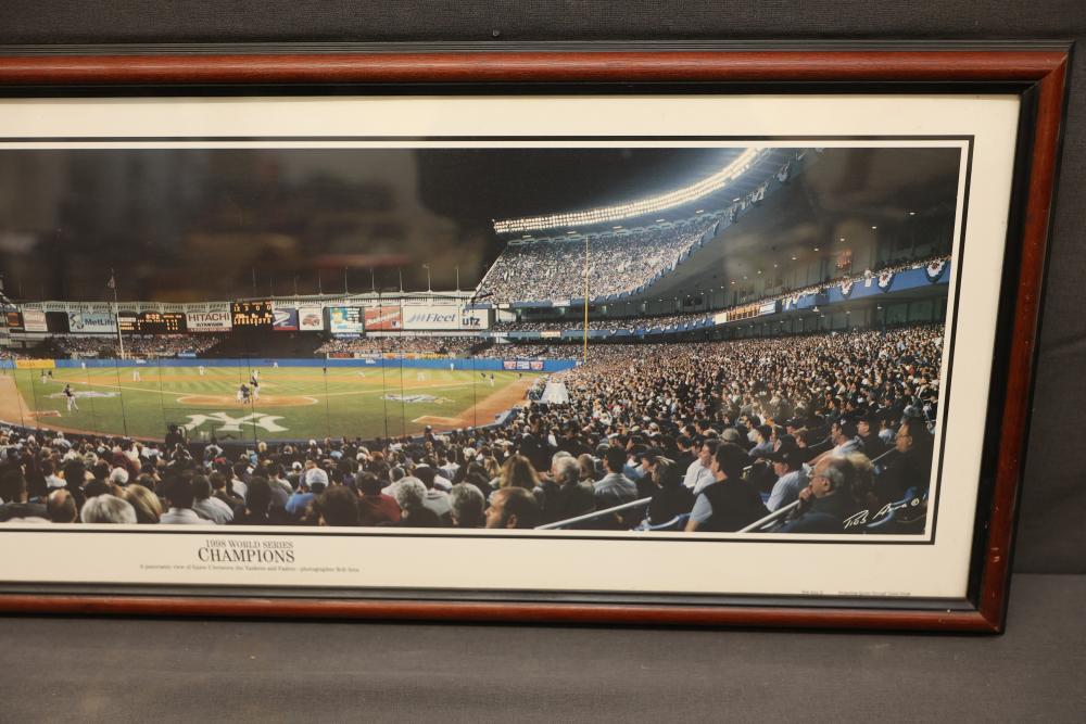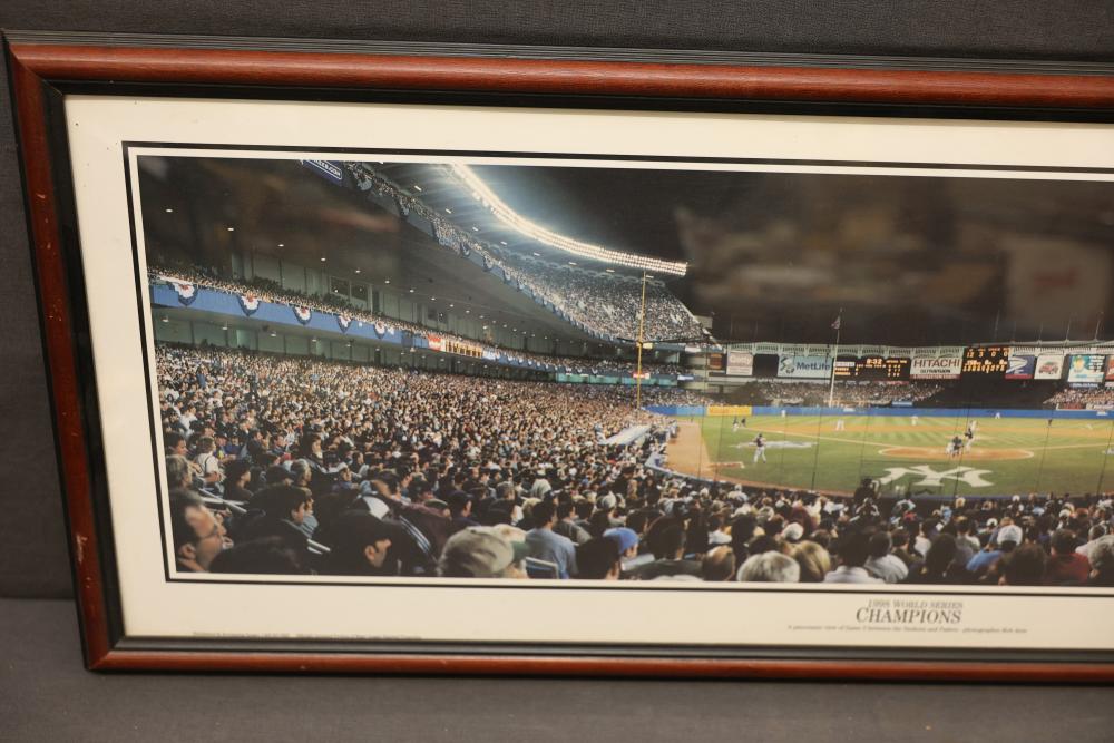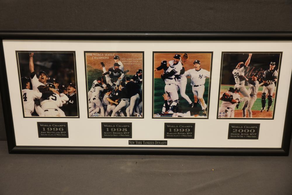 Framed New York Yankees memorabilia featuring autographed items and photographic displays. Includes a framed collage commemorating the Yankees' World Series Championship wins in 1996, 1998, 1999, and 2000, as well as a framed stadium panorama and an autographed photo of Roger Clemens in action. Additional framed items include a Subway Series poster and a historic photograph of a group assembly. Pickup only.