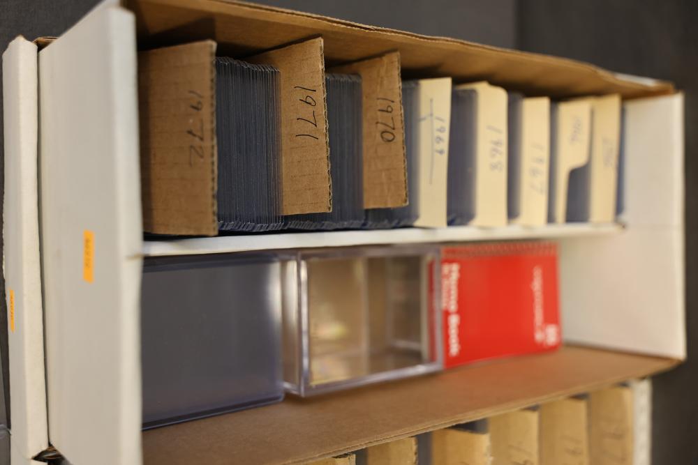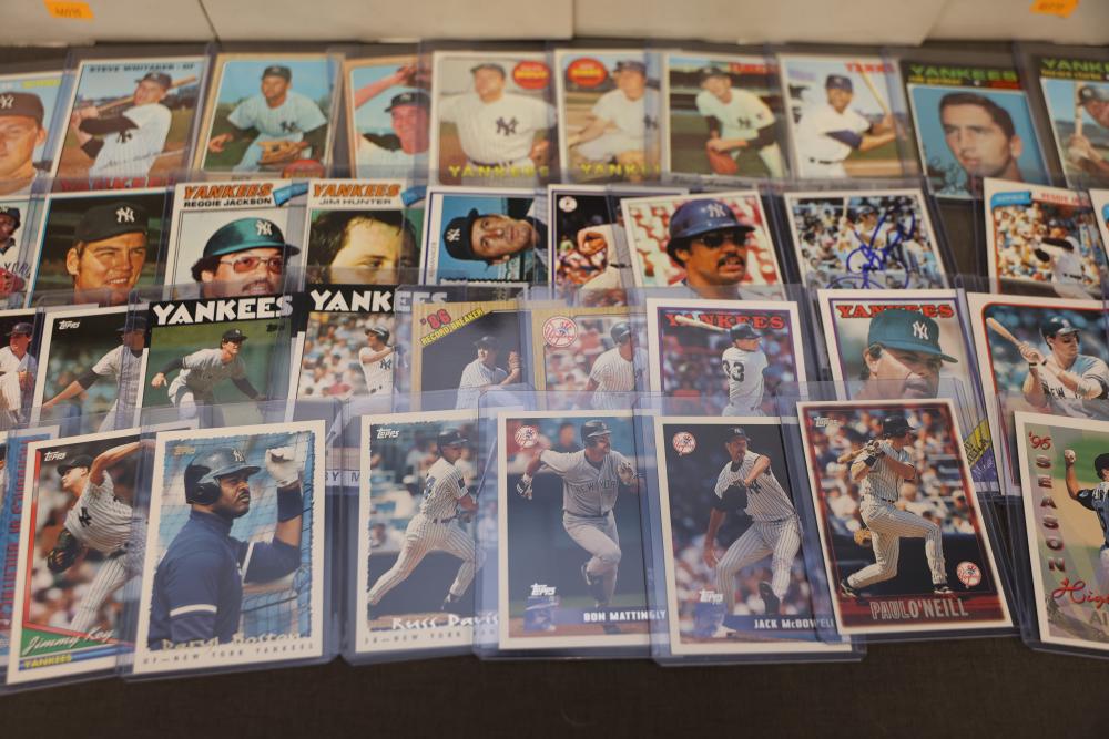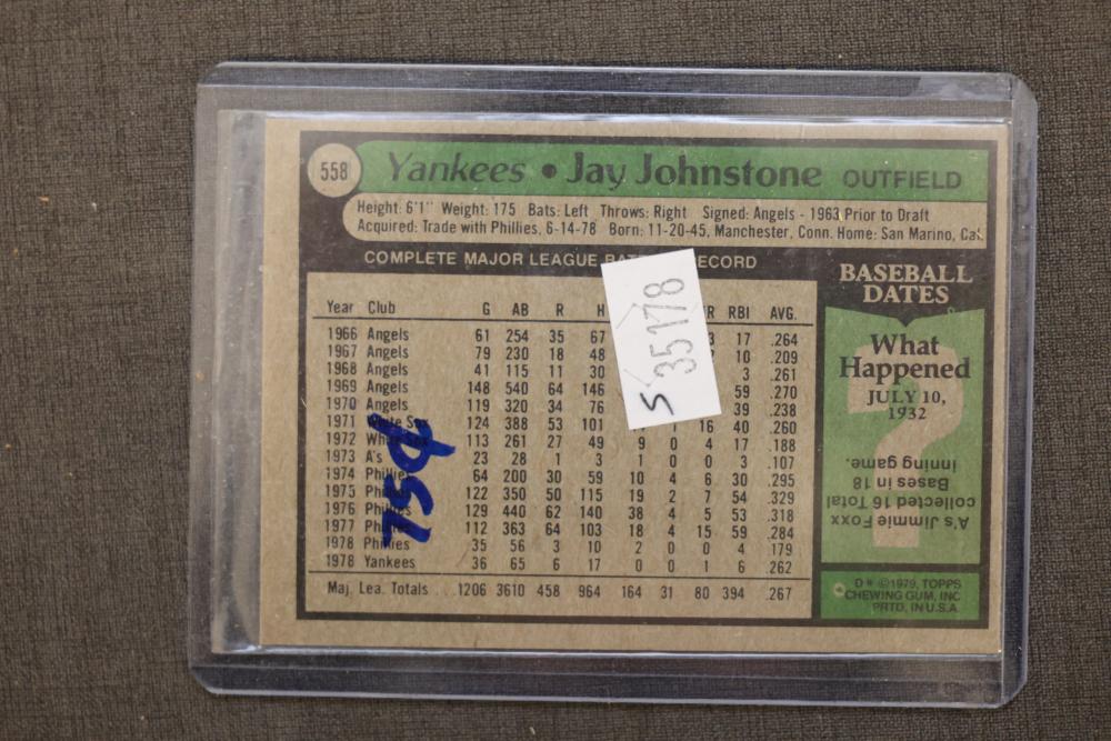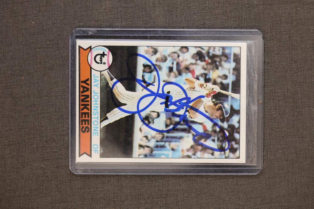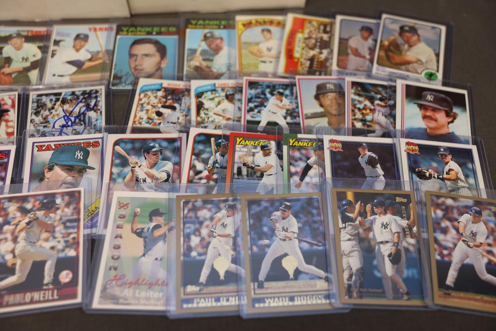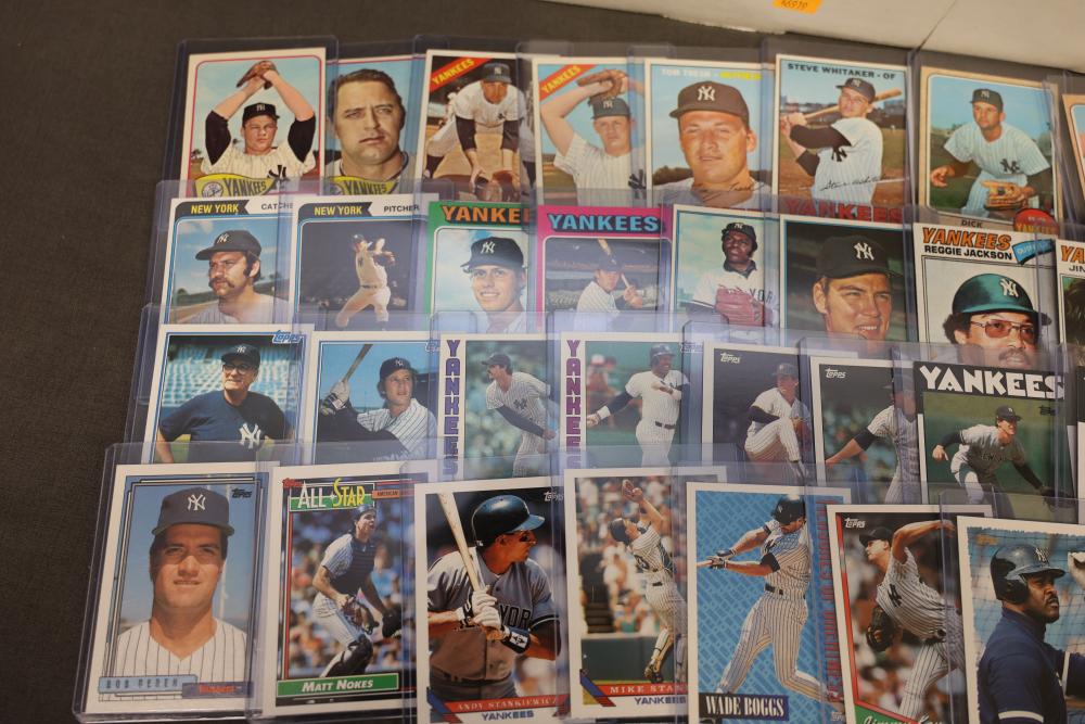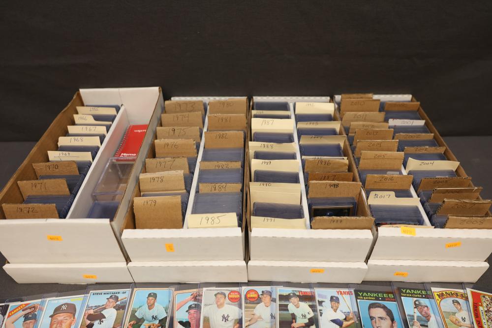 Topps New York Yankees baseball cards ranging from 1964 to 2018. Includes a signed 1978 Jay Johnstone card. The collection is organized in boxes by years, including numerous cards across decades, featuring players and highlights of the Yankees. Cards are in a mix of conditions. Pickup only.