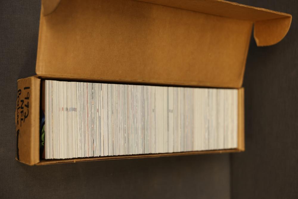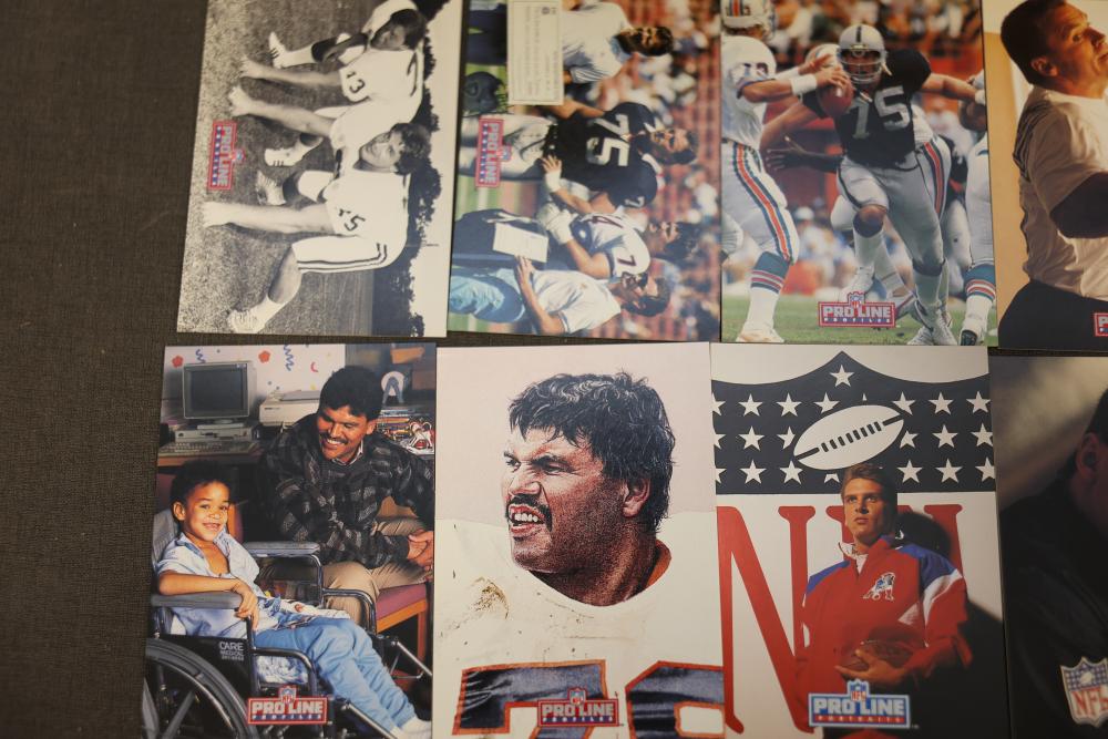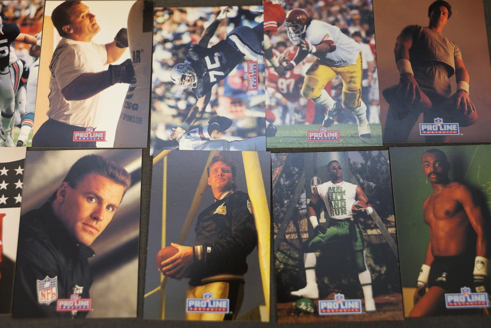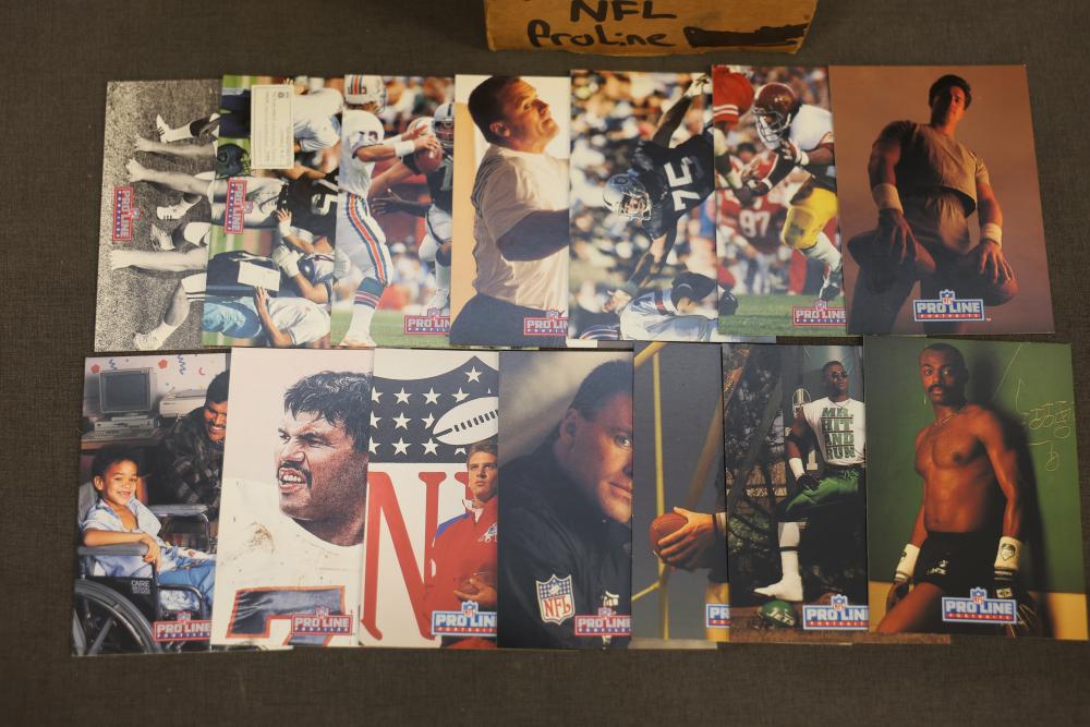 1992 NFL ProLine card series including ProLine Profiles cards and ProLine Portraits cards. Cards are stored in a long cardboard box labeled with '1992 NFL ProLine.' Includes a variety of professional football player cards, some with action shots and others with personal portraits. Cards overall appear to be in maintained condition housed in the original box. Pickup only.