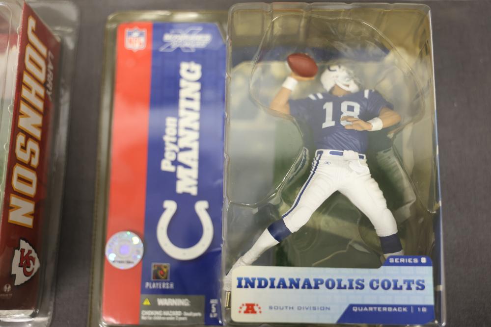 Sports Action Figures Featuring Gretzky, Lemieux, Smith, Marino, and More. Includes sealed action figures of prominent sports icons like Wayne Gretzky, Mario Lemieux, Emmitt Smith, Dan Marino, Peyton Manning, Reggie Bush, John Elway, Larry Johnson, Walter Payton, and others. Each figure is in its original packaging. Pickup only.