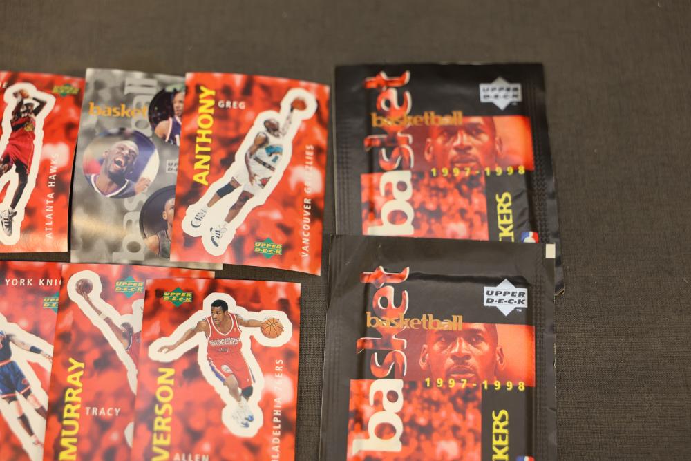 1997-1998 Upper Deck NBA Stickers-Majority Unopened. A collection of NBA-themed stickers from the 1997-1998 season, produced by Upper Deck. Most stickers remain in their original sealed packaging. Includes loose stickers featuring notable players and teams. Box indicates contents as unopened NBA Stickers. Ideal for collectors or sports enthusiasts. Pickup only.