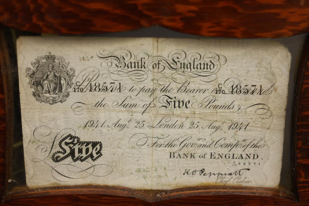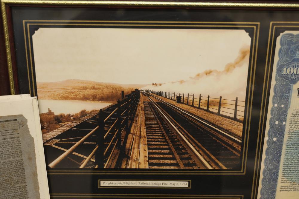 Framed New York Central & Hudson River Stock Certificate With Additional Items. Includes a framed $1,000 stock certificate accompanied by a $10 U.S. Treasury note and a £5 Bank of England note contained in wooden frames. Also contains imagery featuring the Poughkeepsie Highland Railroad Bridge Fire and a Windham Herald newspaper publication. Pickup only.