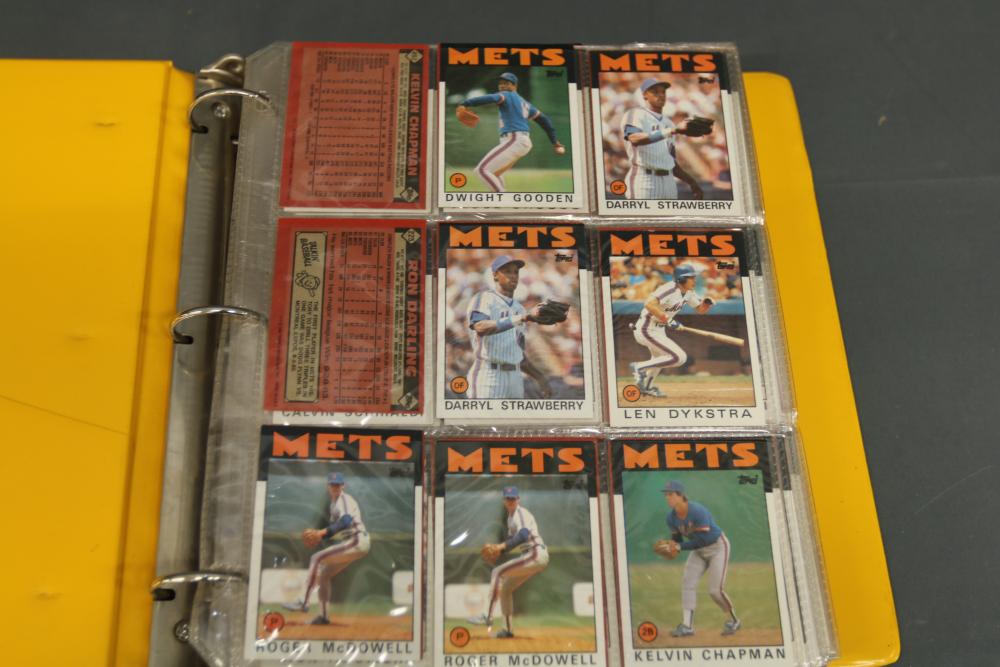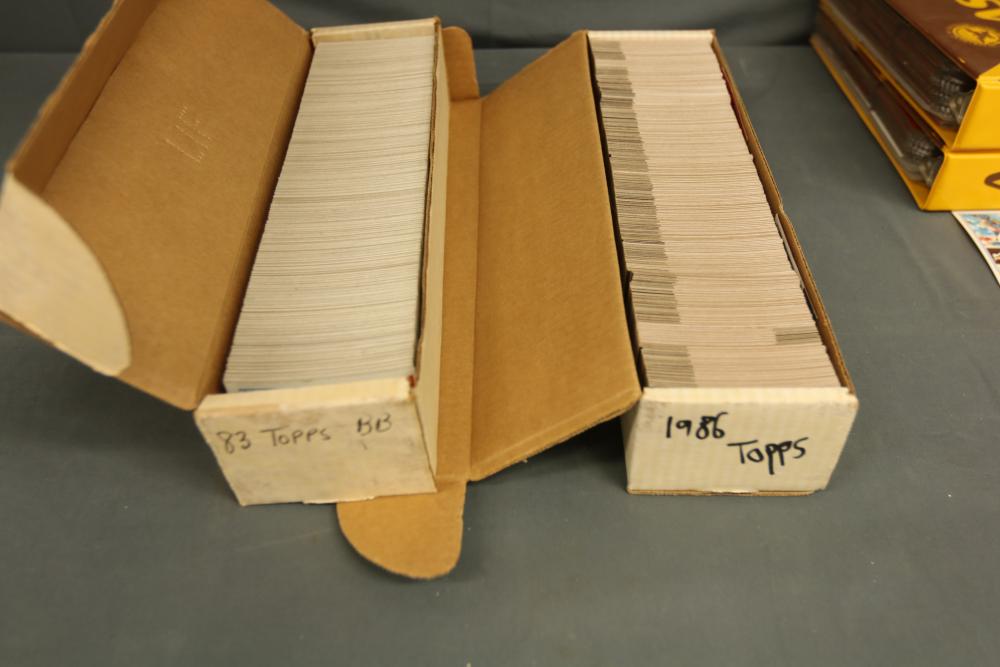 Baseball cards from Topps 1983 series, Topps 1986 series, Topps 1987 series, and Topps 1991 series. Cards are stored in binders and boxes, featuring various teams and players. Includes All-Star cards and key players of those years. Cards appear to be organized by team and series. Pickup only.