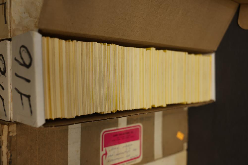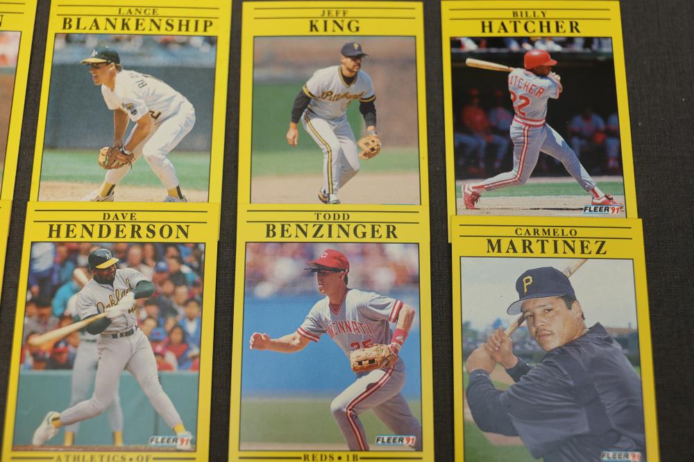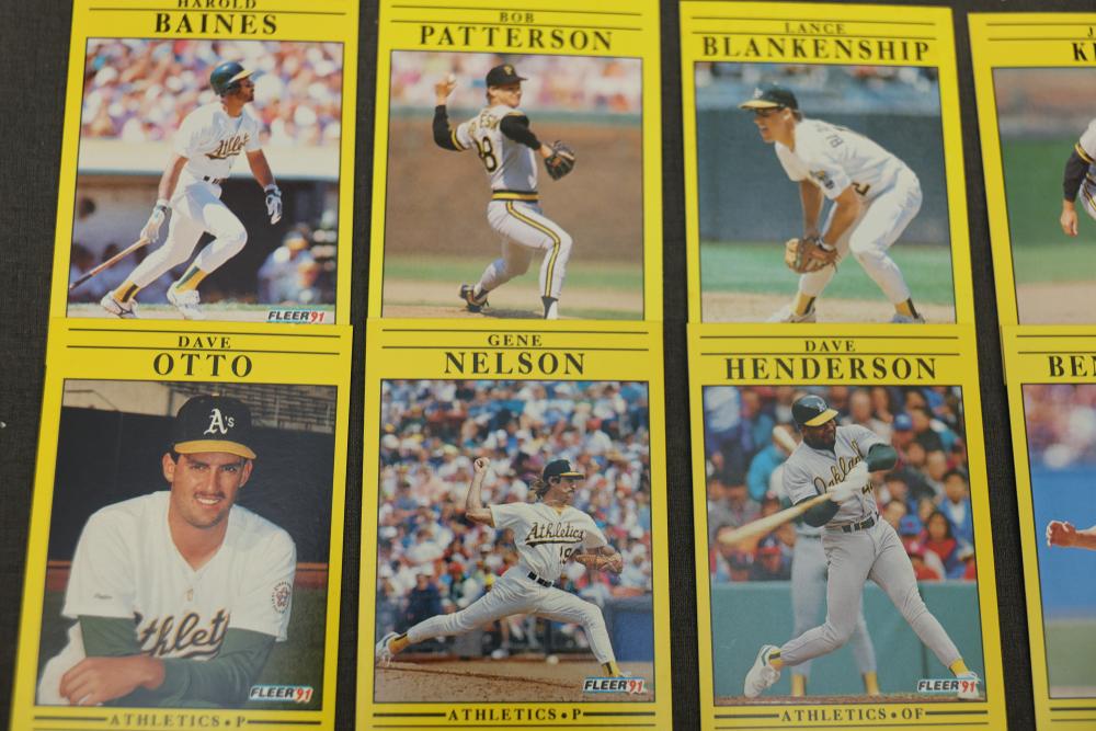 Baseball cards from 1991 Fleer set. Includes multiple cards organized in boxes, with players such as Lance Blankenship, Dave Otto, and Rickey Henderson among others. Cards feature distinctive yellow borders and are stored neatly in labeled boxes. Pickup only.