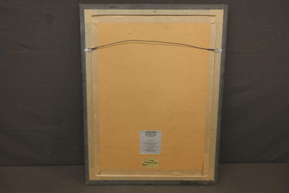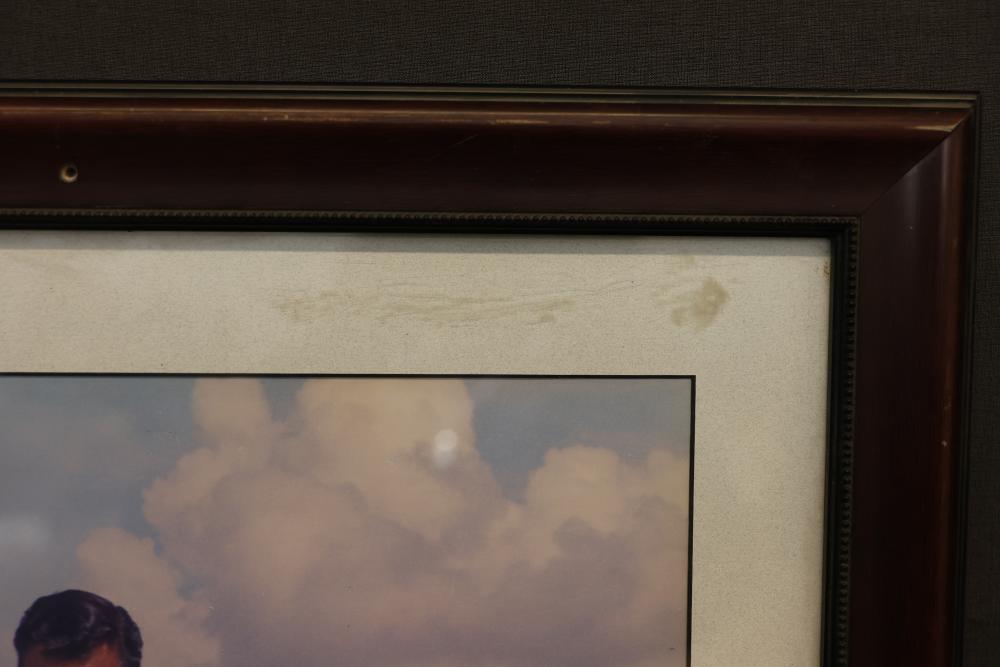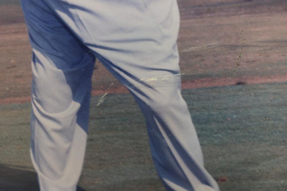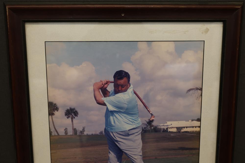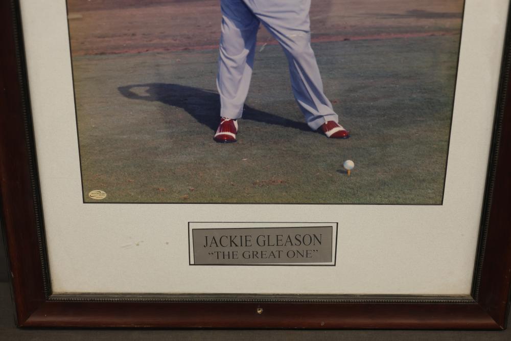 Framed Jackie Gleason Golf Photograph With Inscribed Plaque. Displays an image of Jackie Gleason golfing paired with a commemorative plaque reading 'The Great One.' The piece is set in a wood frame with a backing and wire hanger for display. Signs of wear include visible scuffs, discoloration on the mat, and marks on the photograph. Pickup only.