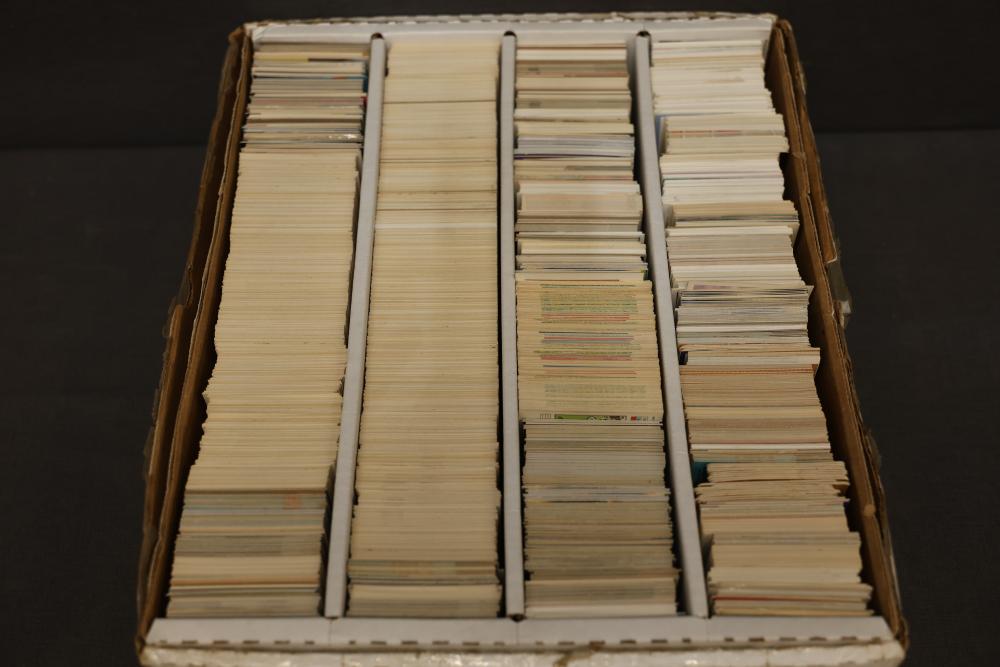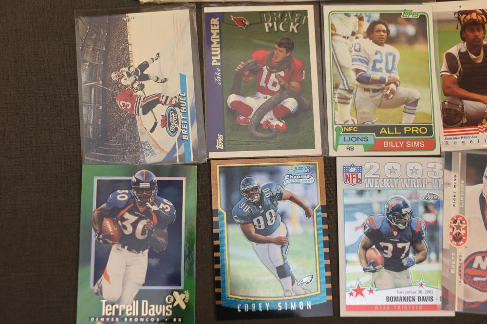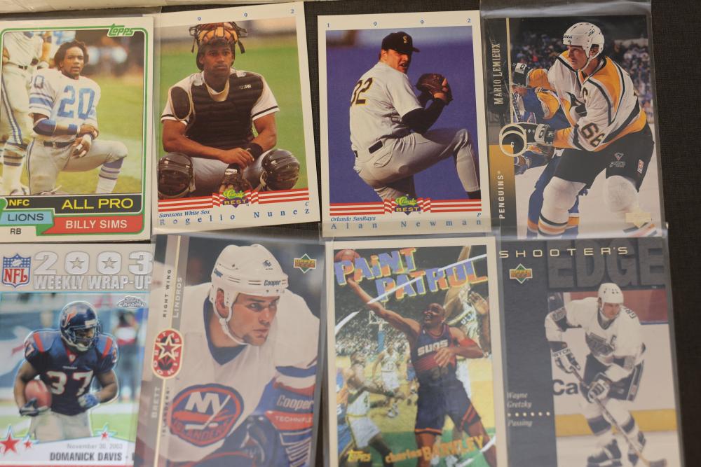 Misc. Baseball, Football, Basketball, and Hockey Sports Cards. Includes a variety of trading cards across multiple sports, housed in a box with organizational dividers. Pickup only.