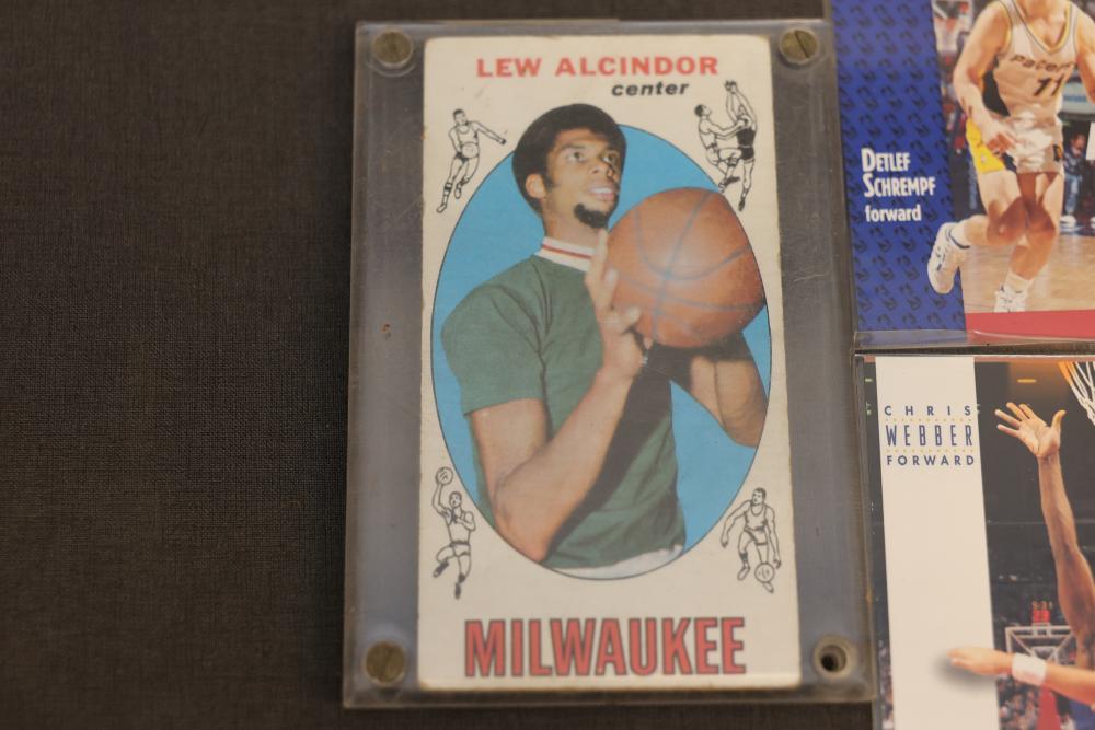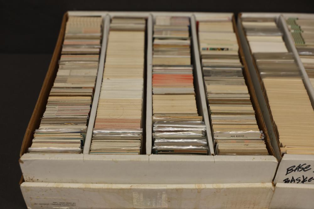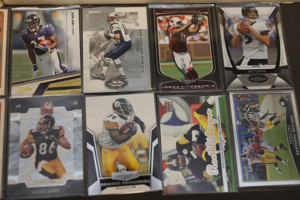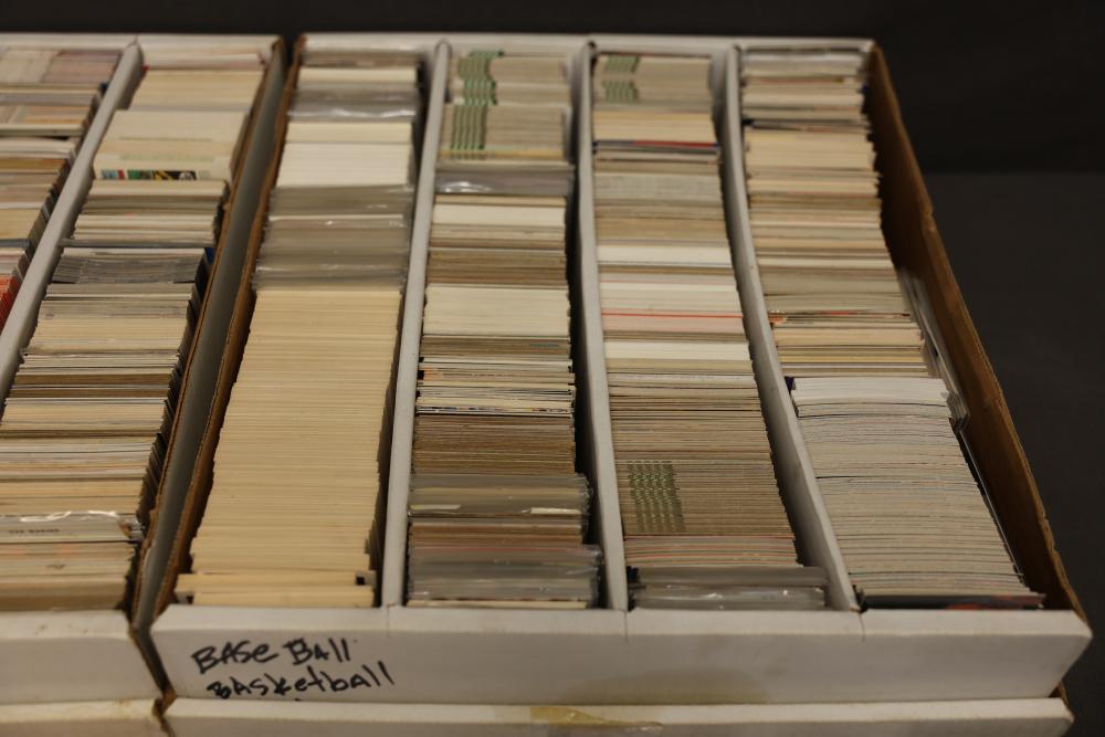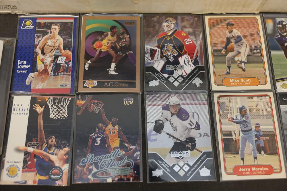 Sports Cards Featuring Lew Alcindor, Larry Fitzgerald, Shaquille O'Neal. Sports card collection includes baseball, football, basketball, and hockey cards. Notable featured players shown include Lew Alcindor, Larry Fitzgerald, Ben Roethlisberger, Shaquille O'Neal, Hines Ward, Delonte West, and Jerry Morales, among others. Includes cards stored in boxes. Pickup only.