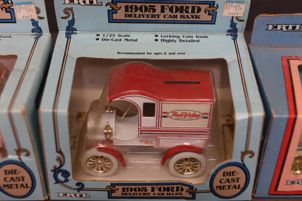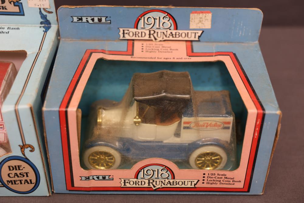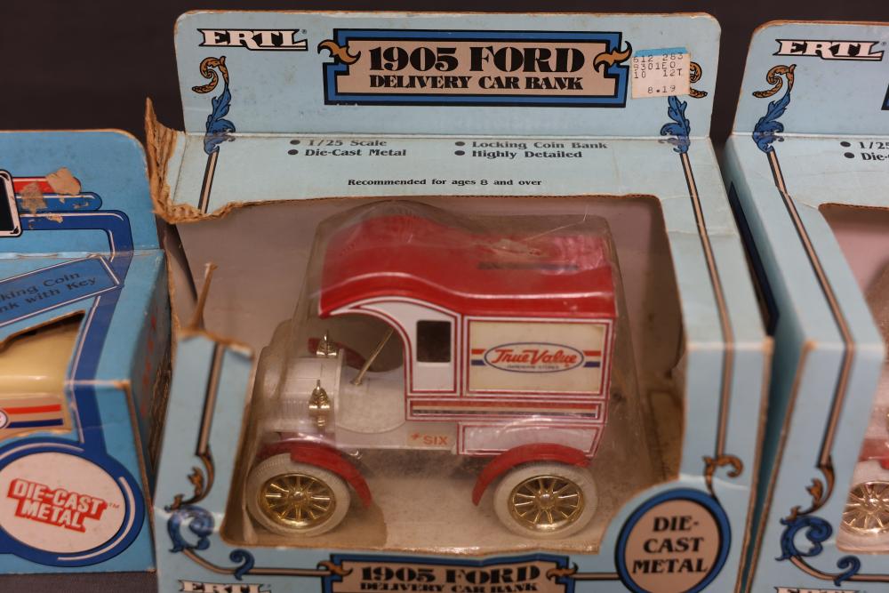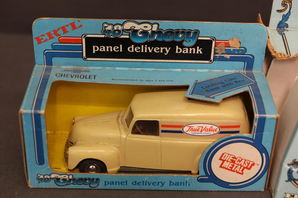 Ertl Die-Cast Metal Chevrolet and Ford Delivery Banks in Original Boxes. Includes 1948 Chevrolet Panel Delivery Bank, 1905 Ford Delivery Car Bank (two pieces with locking coin banks), and 1913 Ford Runabout Delivery Car Bank. All pieces appear to come in their original packaging. Pickup only.