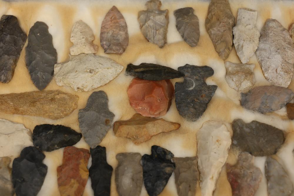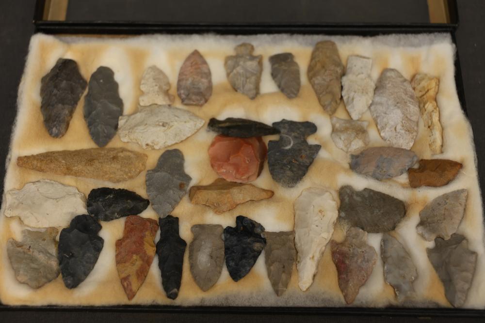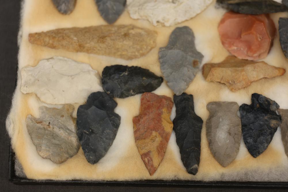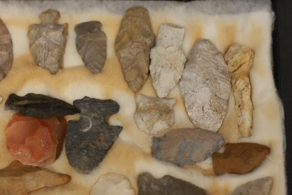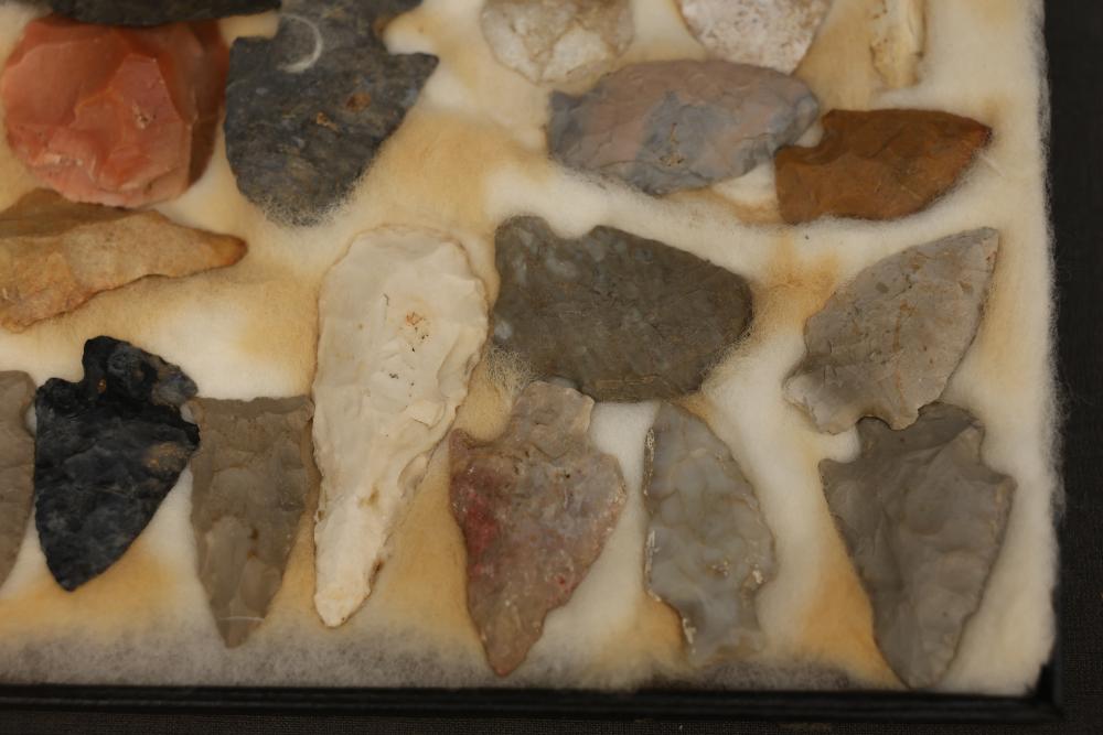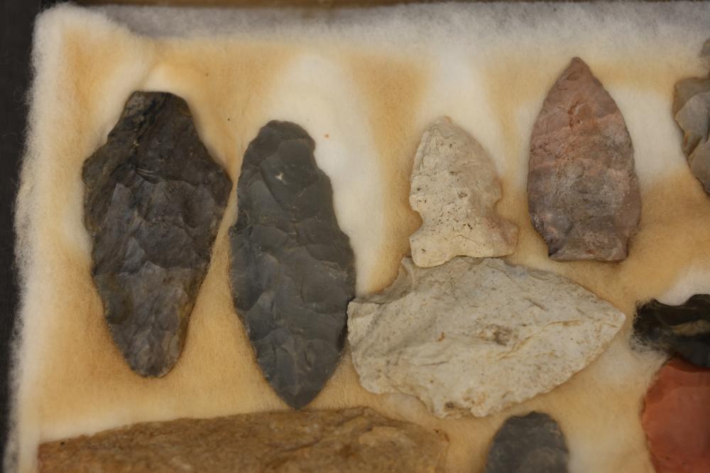 Framed display of arrowheads and stone tools. Features a variety of lithic artifacts of different shapes and sizes, with materials including chert and flint. Each piece is securely mounted on a padded backing within a black-framed case. Pickup only.
