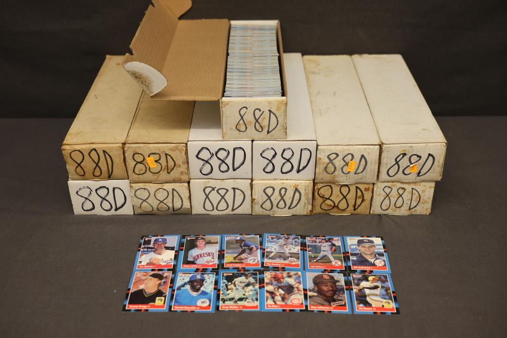 Baseball Cards From the 1988 Donruss Series Set. Includes multiple cards organized in labeled boxes with visible individual cards featuring players such as Tim Belcher and Harold Reynolds. Cards are shown stored in boxes marked '88D,' indicating the 1988 Donruss series. Pickup only.