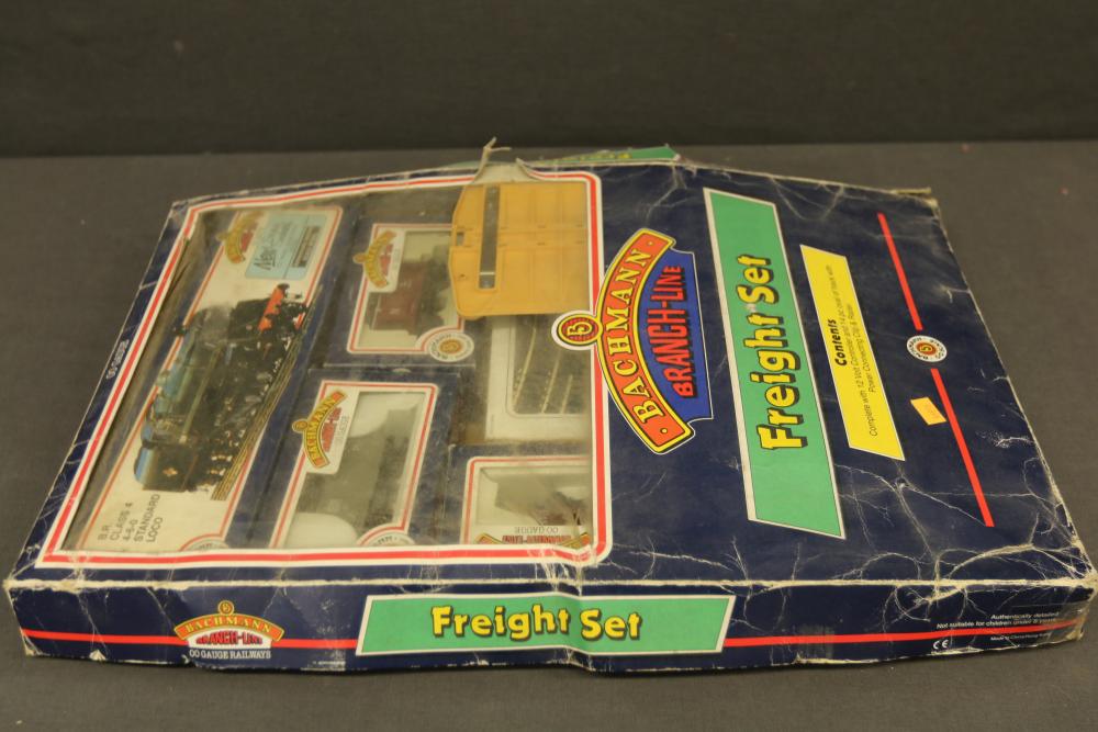 Bachmann Branch-Line Freight Set with Accessories includes various freight cars, a BR Class 4 4-6-0 Standard Locomotive, track components, a transformer, and operating accessories. Original boxes are included, though showing signs of wear. The set also includes a Peco Setrack Planbook and Hornby Track Planbook. Pickup only.