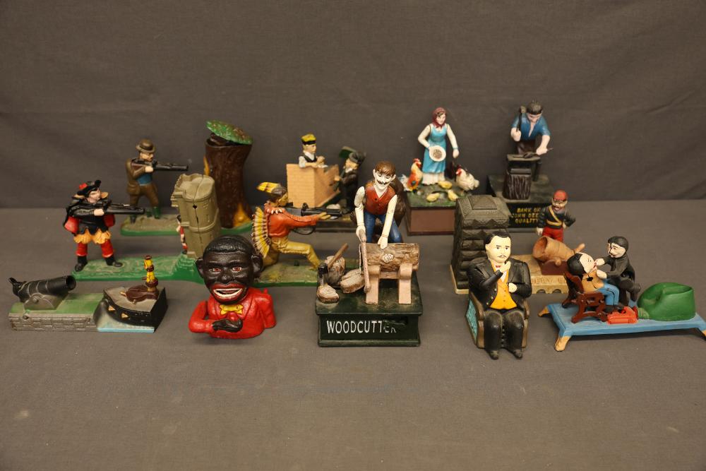 Cast Iron Mechanical Banks and Figurines. Includes numerous mechanical banks and figurines with intricate designs and functioning mechanisms. Stamped with various markings, many pieces are reproductions or designed after historical models. Includes characters and scenes such as Woodcutter, artillery setups, and more. Pickup only.