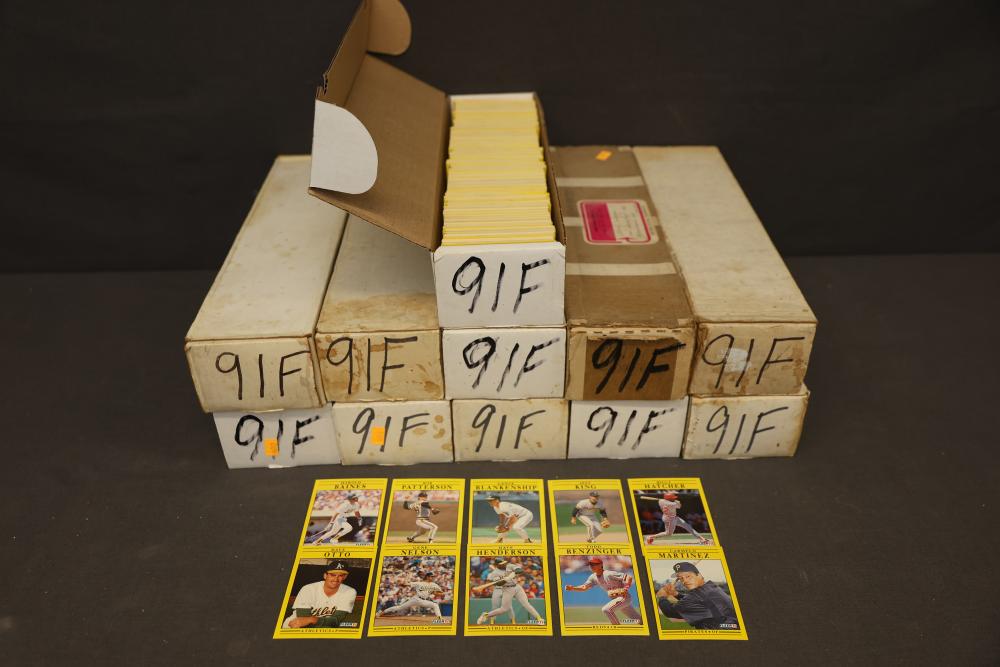 Baseball cards from 1991 Fleer set. Includes multiple cards organized in boxes, with players such as Lance Blankenship, Dave Otto, and Rickey Henderson among others. Cards feature distinctive yellow borders and are stored neatly in labeled boxes. Pickup only.
