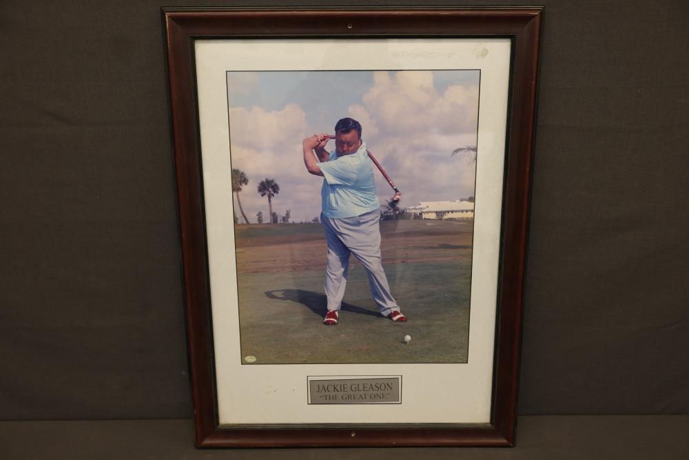 Framed Jackie Gleason Golf Photograph With Inscribed Plaque. Displays an image of Jackie Gleason golfing paired with a commemorative plaque reading 'The Great One.' The piece is set in a wood frame with a backing and wire hanger for display. Signs of wear include visible scuffs, discoloration on the mat, and marks on the photograph. Pickup only.