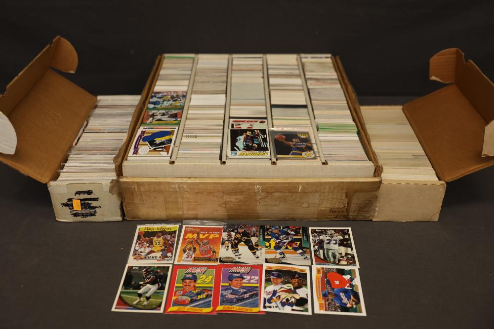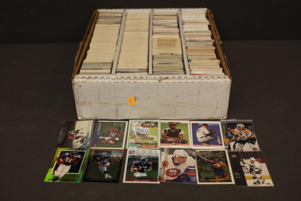 Sports Cards Featuring Baseball, Football, Basketball, and Hockey. Includes a large quantity of cards organized in boxes, spanning various teams and players. Cards are from multiple eras and cover different aspects of these sports genres. Pickup only.