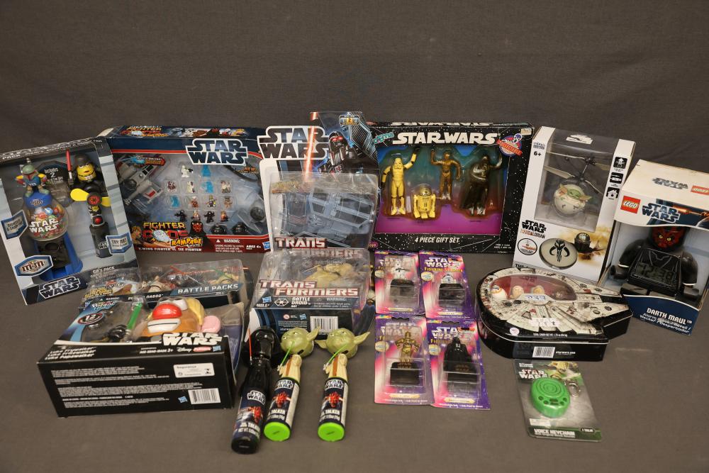 Star Wars Figurines and Collectibles. Includes a variety of items, such as character figurines, themed accessories, and toys. Items include sealed and boxed action figures, miniature collectibles, themed packaging, and novelty items. All pieces feature Star Wars branding. Pickup only.