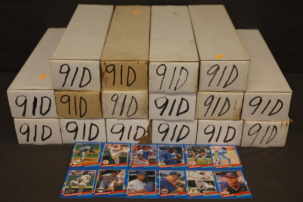 Baseball cards from 1991 Donruss series. Includes multiple boxes of cards securely stored in white storage containers marked '91D.' Cards are from the 1991 edition of Donruss and feature various players. Boxes appear to contain a significant quantity of cards. Pickup only.