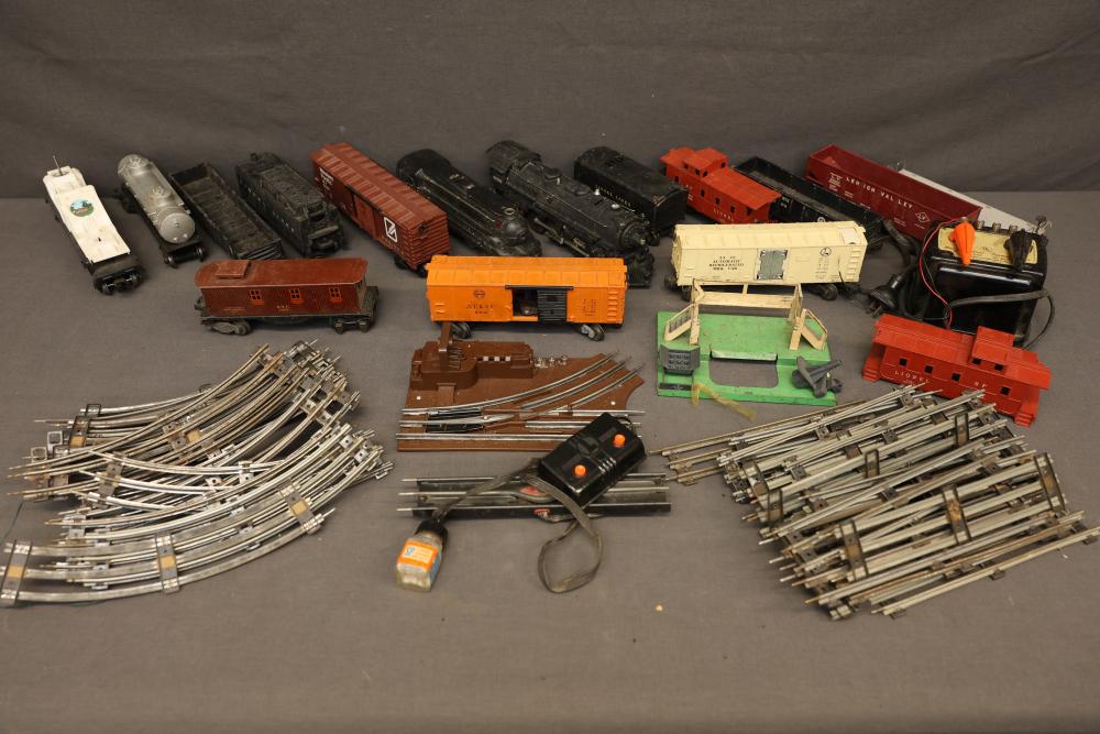 Lionel Train Set with Locomotives, Cars, Transformer, and Accessories. Includes Lionel Locomotive #2331, Lionel Locomotive #2055, Pennsylvania Gondola #6452, Red Caboose #6257, Sunoco Tank Car #6465, Caboose #1682, Operating Milk Car #3472, Operating T.V. Car #16670, Central Operating Box Car #3464, Black Tender #1689T, Western Pacific Box Car #9452, Hopper Car #6456, Transformer #1033, Milk Car with Platform #3472, Gondola Car #6462, Turnout Switch #5121, Remote Control Track #6019, and Whistle/Blower Box Car #2046W. Includes additional tracks, accessories, and documents. Pickup only.