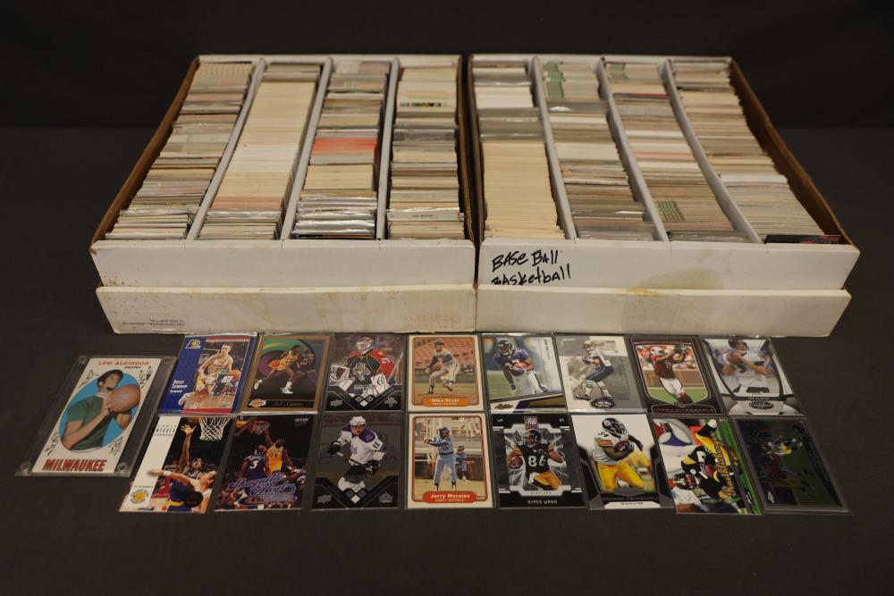 Sports Cards Featuring Lew Alcindor, Larry Fitzgerald, Shaquille O'Neal. Sports card collection includes baseball, football, basketball, and hockey cards. Notable featured players shown include Lew Alcindor, Larry Fitzgerald, Ben Roethlisberger, Shaquille O'Neal, Hines Ward, Delonte West, and Jerry Morales, among others. Includes cards stored in boxes. Pickup only.