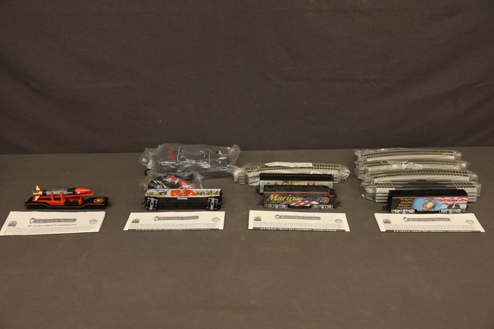 Hawthorne Village HO Scale Train Collectibles Featuring U.S. Marines Theme. Includes a locomotive, cars with detailed military artwork, track sections, and a power controller. Pieces come with documentation and appear to be in unused, packaged condition. Pickup only.