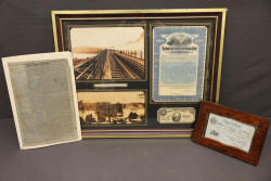 Framed New York Central & Hudson River Stock Certificate With Additional Items. Includes a framed $1,000 stock certificate accompanied by a $10 U.S. Treasury note and a £5 Bank of England note contained in wooden frames. Also contains imagery featuring the Poughkeepsie Highland Railroad Bridge Fire and a Windham Herald newspaper publication. Pickup only.