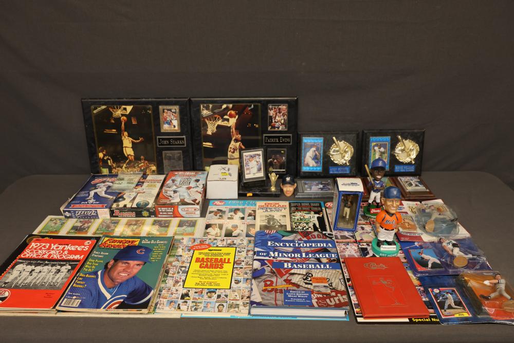 Sports Memorabilia Featuring Plaques, Figures, and Cards. Includes commemorative plaques of baseball players such as Andy Pettitte and Bernie Williams, bobblehead figures, action figures, collector cards, and magazines. Highlights cover various players and events. Pickup only.