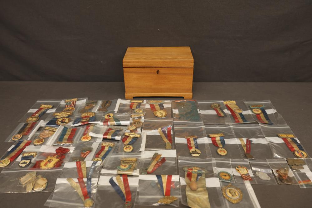 Fraternal, Patriotic, and Commemorative Medals and Ribbons. Includes ribbons and medals with themes related to membership, patriotism, and special events. Items feature inscriptions such as P.O. of A and imagery like American flags, statues, and fraternal symbols. Pickup only.