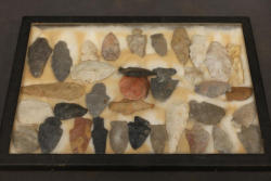 Framed display of arrowheads and stone tools. Features a variety of lithic artifacts of different shapes and sizes, with materials including chert and flint. Each piece is securely mounted on a padded backing within a black-framed case. Pickup only.